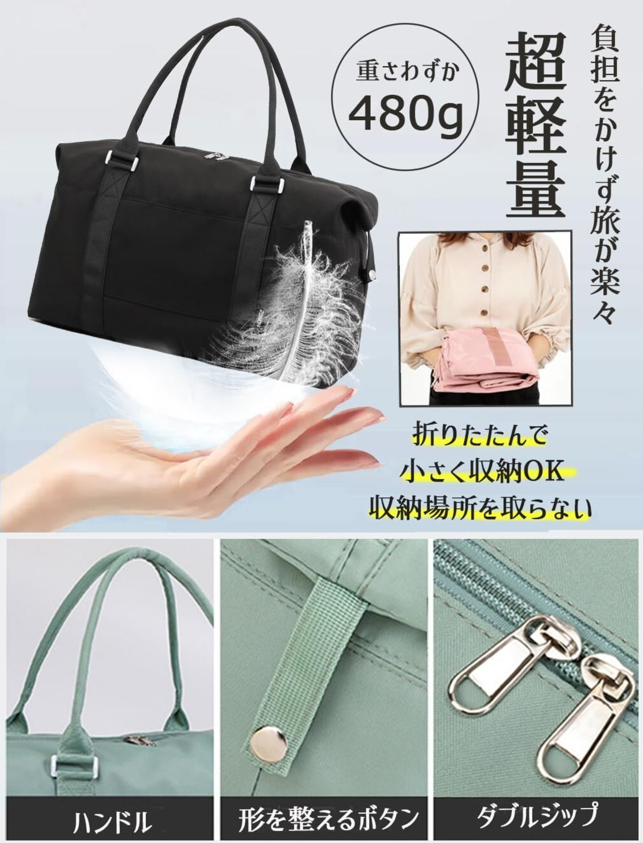 【大容量なのに超軽量・コンパクト】本体の重量はたった480g!旅行中に負担をかけず軽やかに出発できます!約A4サイズに小さく折りたたんで収納可能で収納場所を取らなく、持ち運ぶのが超便利です。