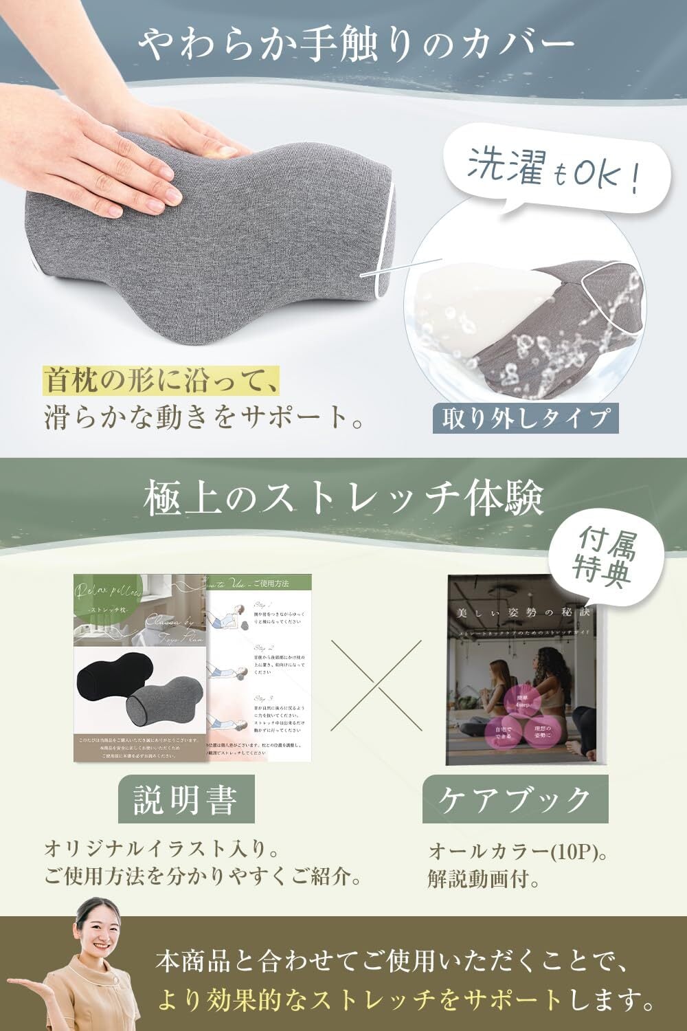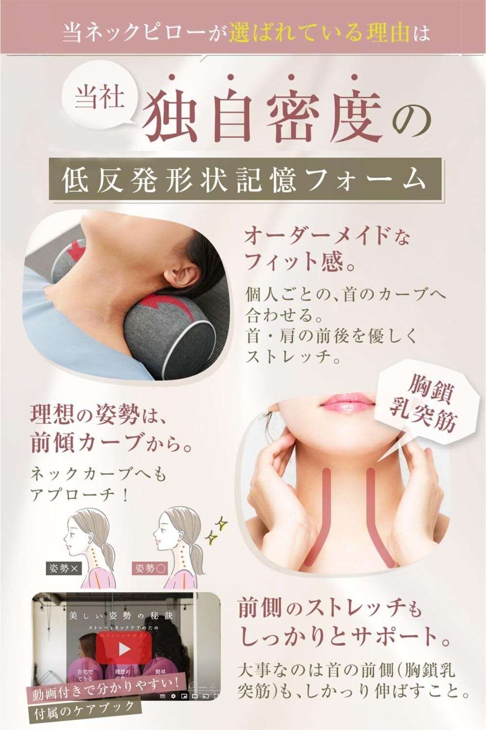 【メディアで話題 柔道整復師監修】特別設計のストレッチ枕は、肩から首を優しく包み込むかのような感覚を実現。首のストレートネックやカーブ、そして前側の胸鎖乳突筋にも的確にアプローチし、心地よいリラクゼーションを提供します。毎日の疲れを和らげ、あなたの美しい姿勢をサポートするために、専門家の知恵を詰め込んだ一品です。