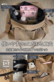 【使い方4way】手提げ、肩掛けの他、付属品のストラップを装着すればショルダータイプとしても使用できます。キャリーオンバッグ機能も付いてますのでキャリーバッグへ取り付ける事も可能です。