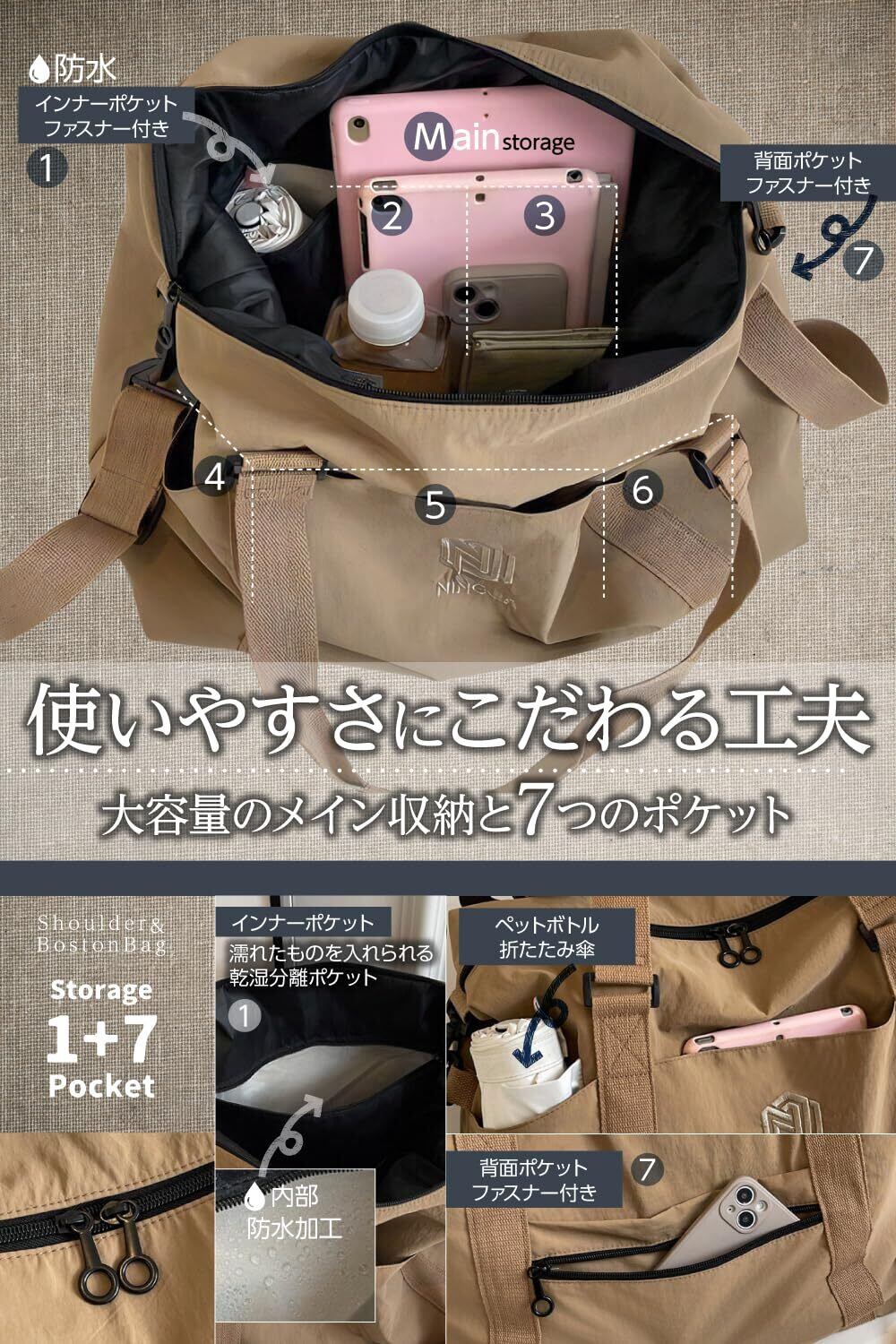 【使いやすいボストンバッグ】弊社のボストンバッグはとにかく使いやすいように細部まで設計しています。負担が少ないように軽量化しつつ、物を沢山入れる事が出来ます。ジム通いや小旅行、通学にオススメです。
