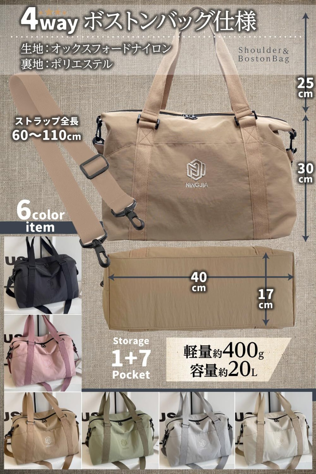 【規格】生地:オリックスフォードナイロン、裏地:ポリエステル、高さ30㎝、横40㎝、幅17㎝、重さ約400g 付属品:ストラップ(60〜110㎝)、折りたたみ時:24㎝×20㎝