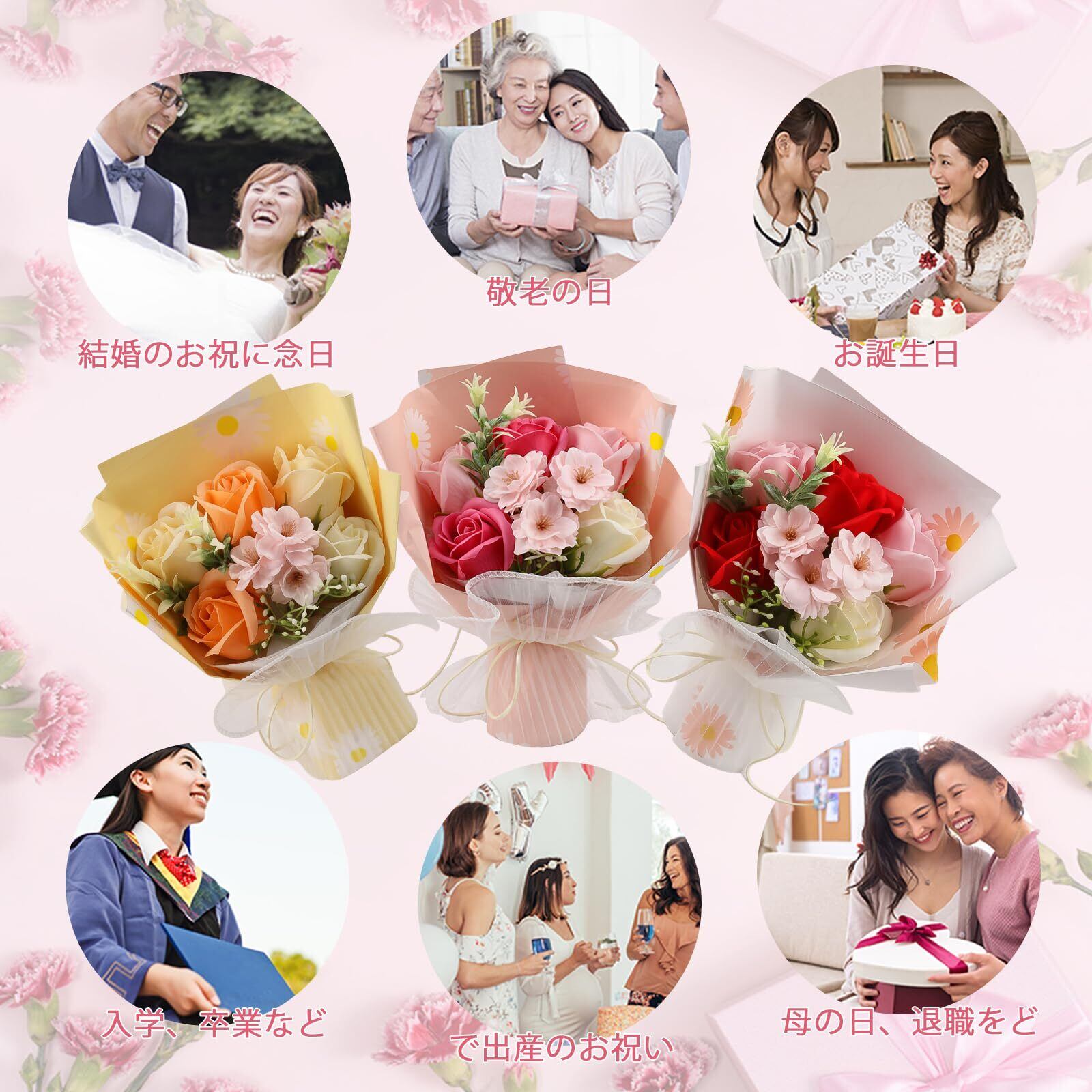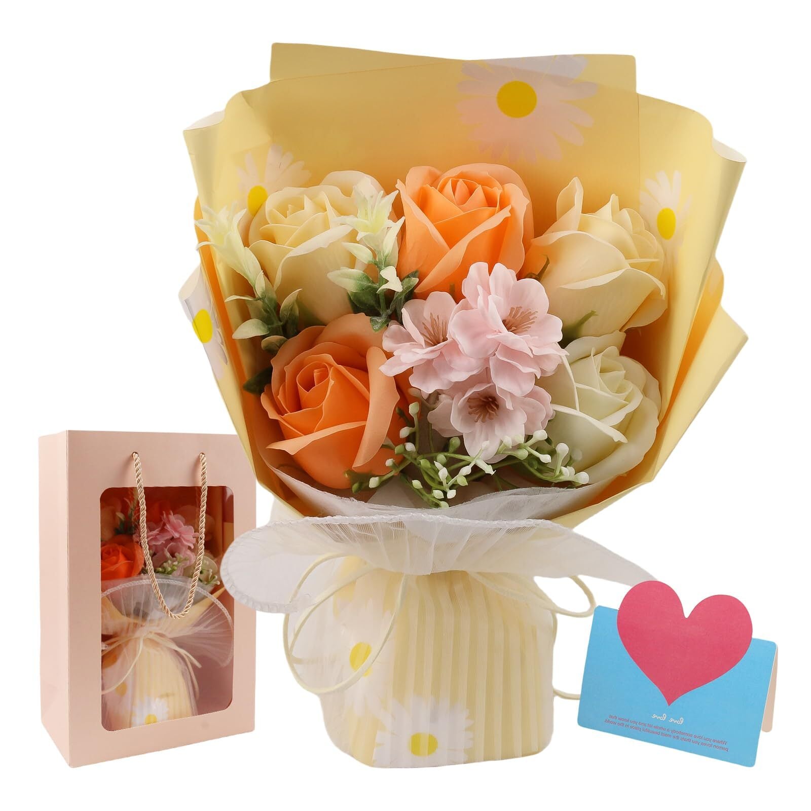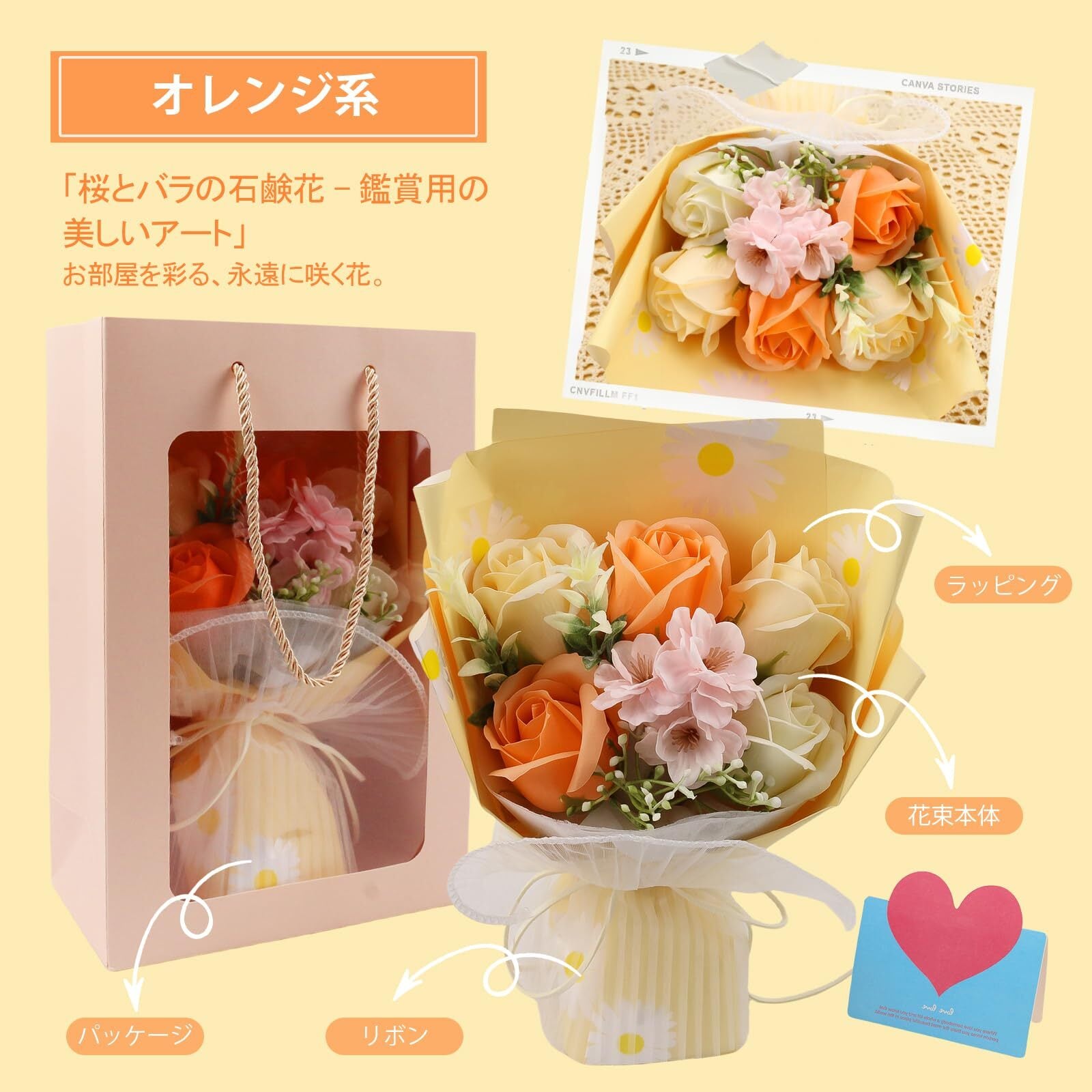 和宅優品 ソープフラワー 花束 父の日や誕生日の贈り物に 枯れない花 ギフトボックス&カード付き 退職祝いや卒業記念にも最適 (オレンジ系桜バラ)