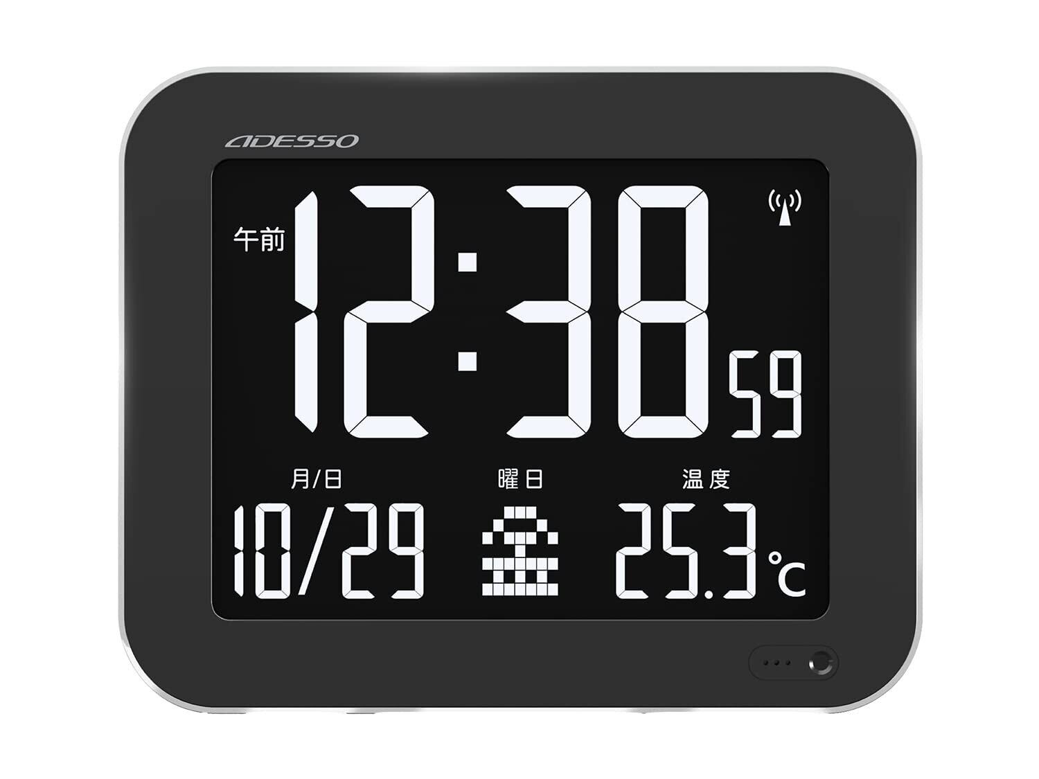 ADESSO(アデッソ) デジタル時計 壁掛け 置き時計 おしゃれ 電波 置き掛け兼用 大型 日付表示 温度 アラーム ブラック