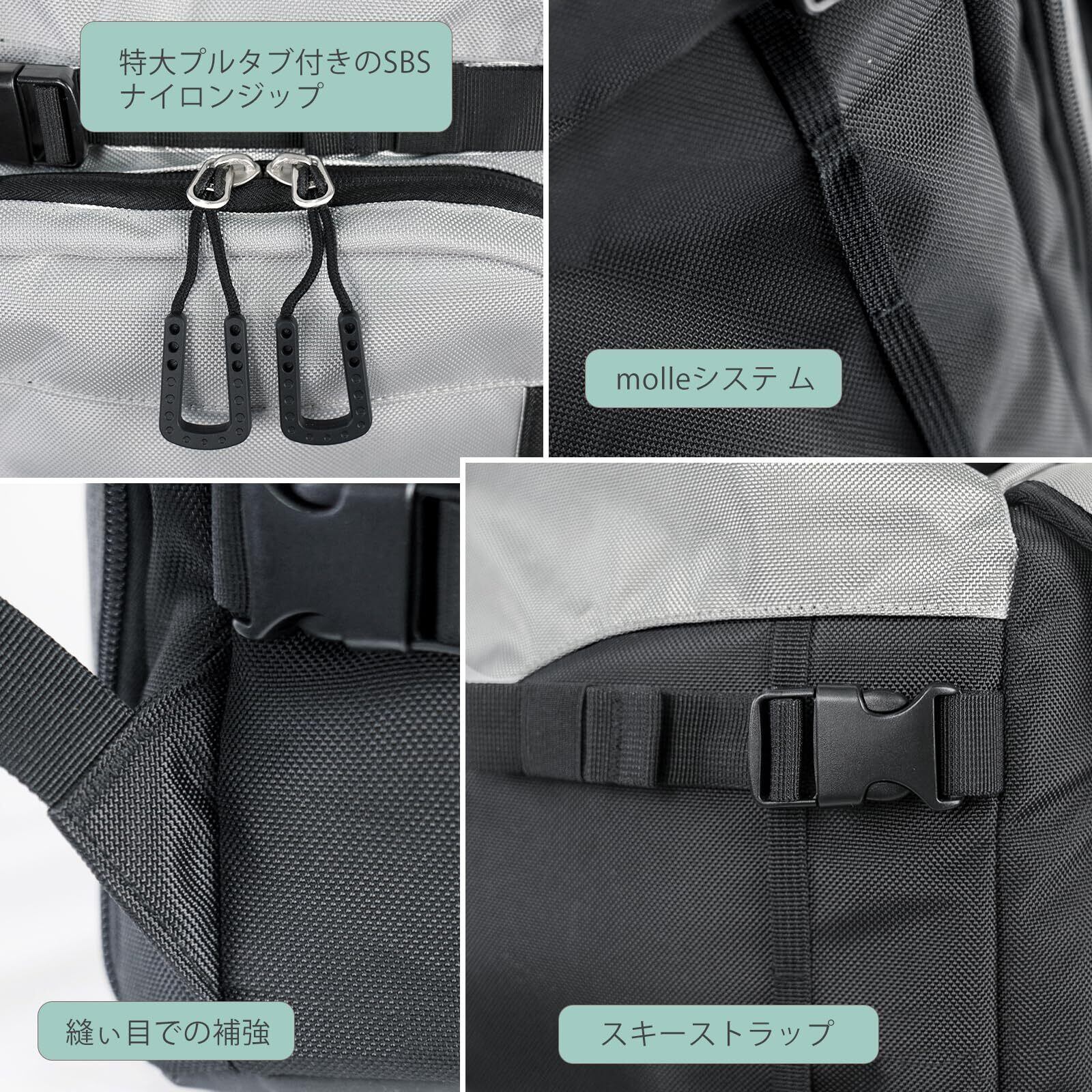 【製品仕様】33cm × 31cm × 51cm、重量:885g、容量:約50L。スキーブーツ収納用ポケットは最大30cmのスキーブーツを収納可能です。人気のブラック、ブルー、グレー、レッド、シルバーグレー 、レイクブルー、アーミーグリーンの7色をラインナップ。気分やお好みに合わせてスタイルを選びます。