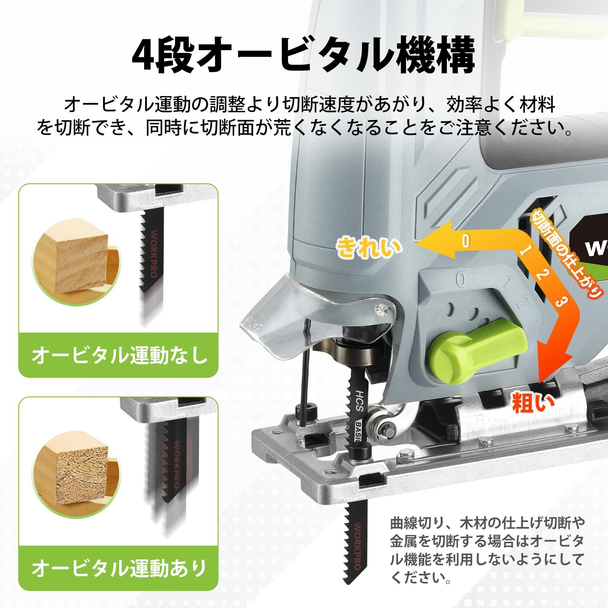 【4段オービタル機構&6段可変速】4段オービタル機構の調整により切断速度があがり、効率よく材料を切断できます。また6段可変速の設計で、切断材料によって自由に適切な速度を選択することもできます。おすすめのポイント:曲線切り、木材の仕上げ切断や金属を切断する場合はオービタル機能を利用しないようにしてください。