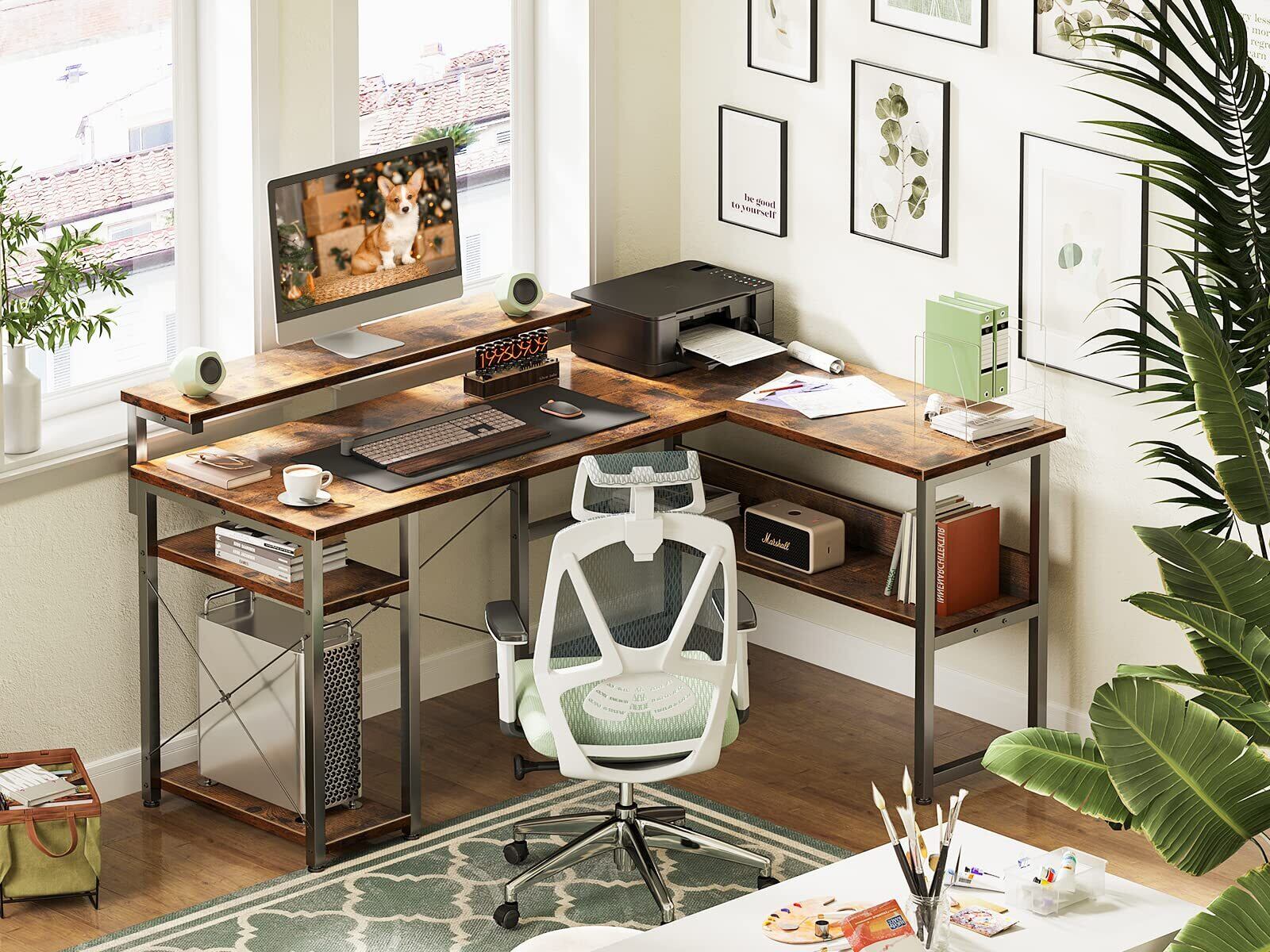 【ラック付きデスク・収納力満載】l字デスクの足元には一体型のラックが備え、本や書類などを使いたい時にサッと取り出せます。たっぷりの収納でデスク周りをスッキリ快適に!また、L字型のデザインで部屋のコーナーを最大限に活用でき、ご家庭でもオフィスでも、日常の仕事に十分なスペースを確保できます。