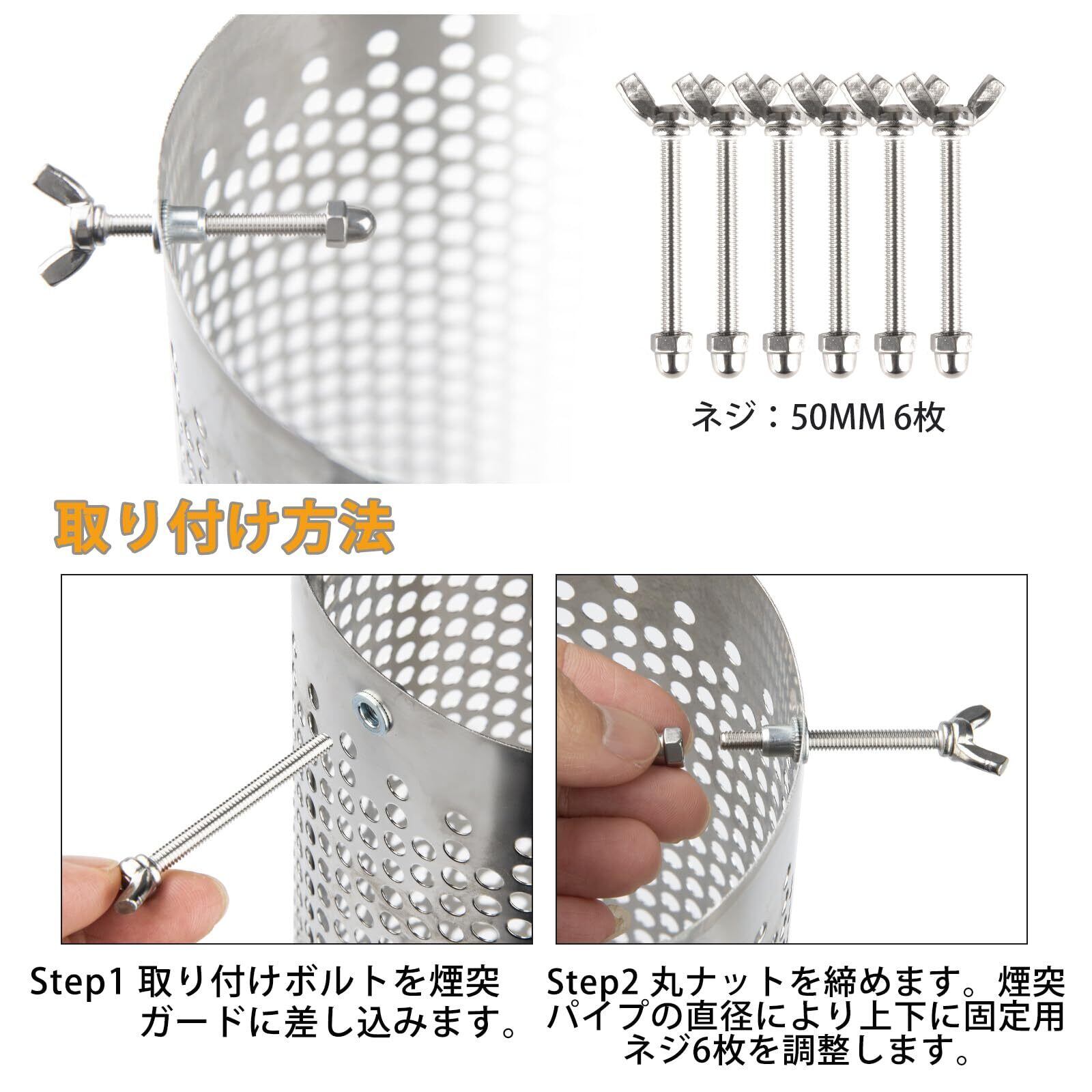 【取付簡単】:取り付けボルトを煙突に締め込み固定するだけです。上下に固定用ネジ6枚と配置、煙突パイプの直径により、ネジを捻じた深みを調整できます。