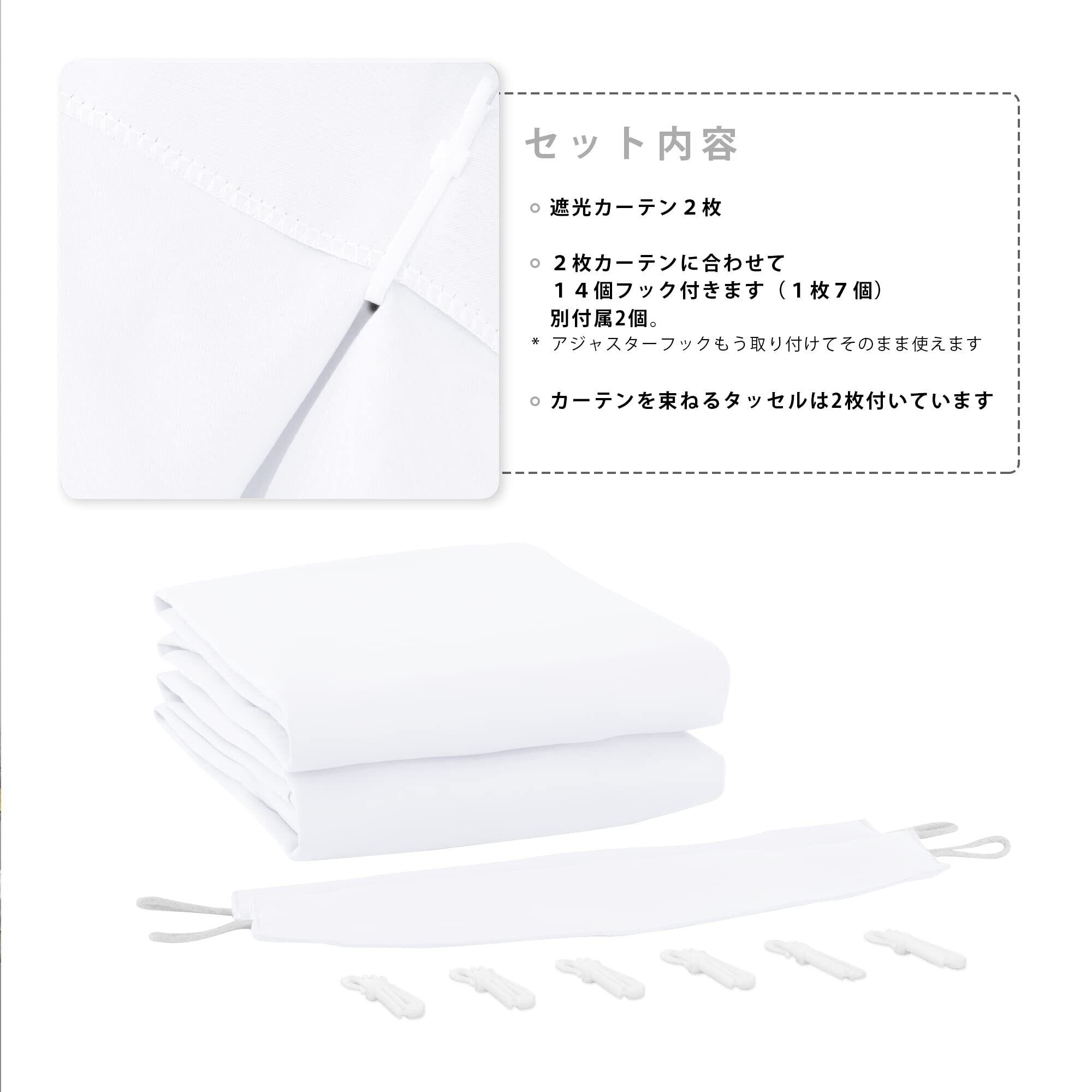 【縫製/付属品】1.5倍ヒダ・ 2ッ山 ・形態安定加工。遮光カーテン2枚入り、共布タッセル2枚付き、アジャスターフック14本付き、高さ6cmまで調節可能です。100%ポリエステルより、耐久性がよい。厚地の生地が絹のような滑らか、輝いているさま光沢があります。