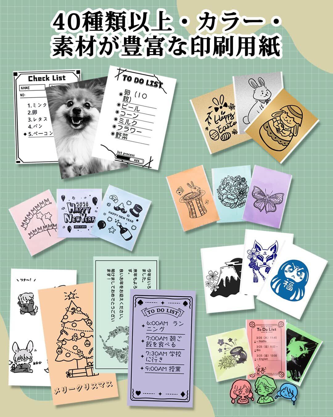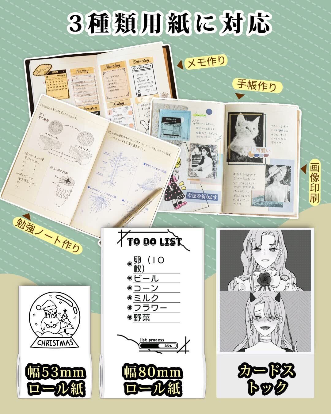 2種類感熱紙に対応:さまざまな場面で活用される幅53 mm・80 mmの感熱紙とカードストックに対応いたします!手帳、勉強、オフィス、整理収納、コラージュ、トラベラーズノートなどに適します。授業中で撮った写真やセミナーの資料などデータを紛失する場合があります。撮影後「Phomemo M03」で即座にプリントアウト、ノートに貼り付けだけで、いつでもどこでも確認できるようになります、データ紛失する恐れはなくなります