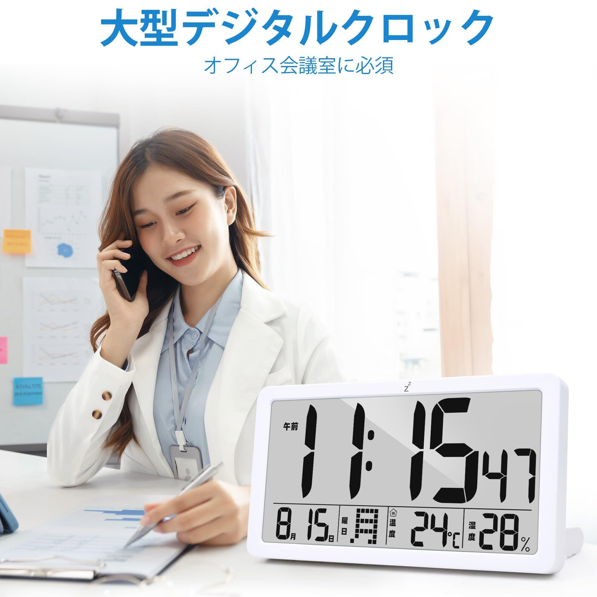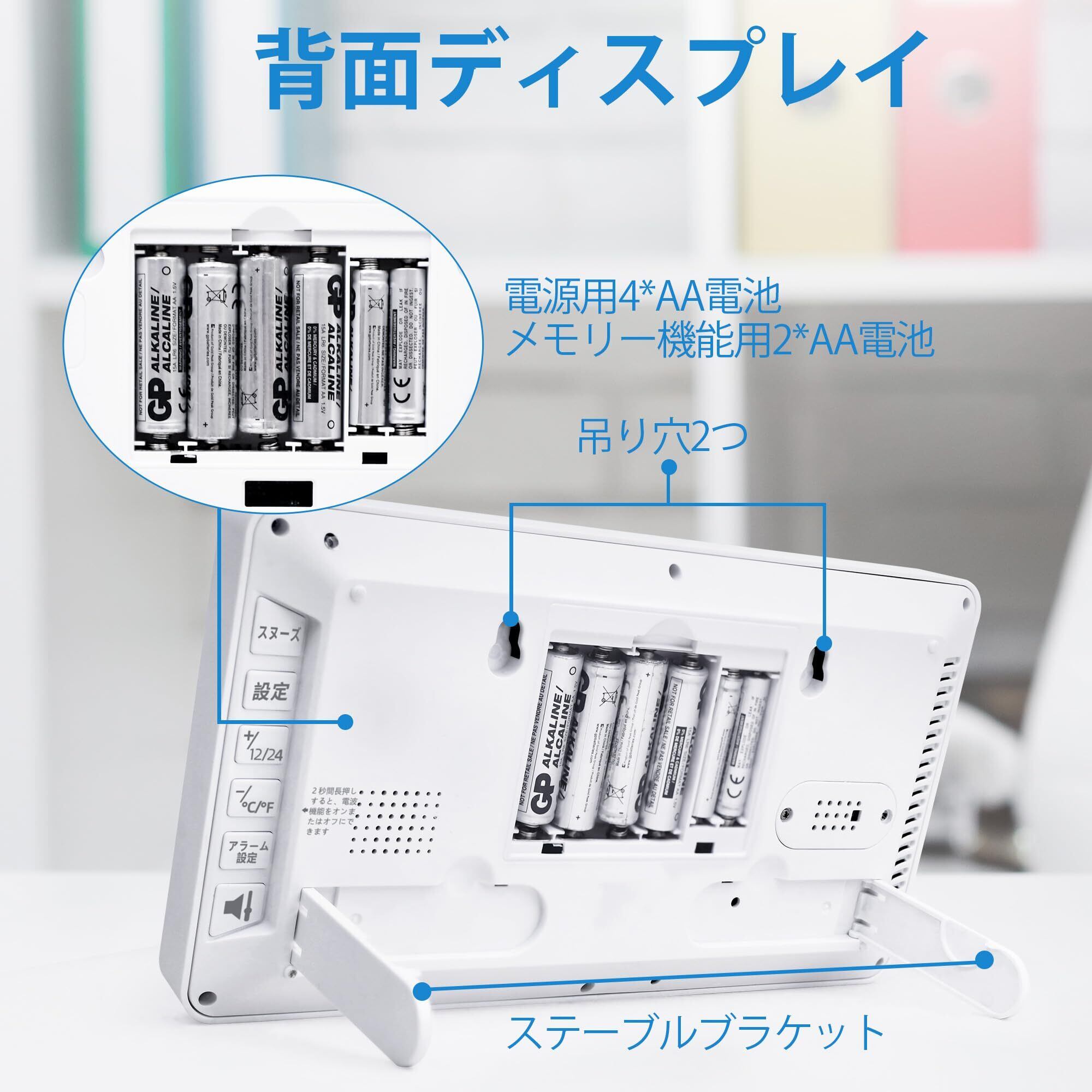 【デジタル電波時計】電波接続による自動時刻補正機能を搭載し、煩わしい時刻調整や誤差の心配は一切ありません。①WIFI 自動時刻修正にも対応 ②℃/℉温度表示切替 ③12/24 時間表示選択 ④カレンダー機能 ⑤曜日表示 ⑥ スヌーズ機能 ⑦メモリ機能を完備。大きく明瞭な数字ディスプレイは、どの角度からも鮮明に読み取れます。このデジタル時計は、正確な時刻情報に加えて曜日、温度、日付を一括表示し、シンプルで快適な視認性を提供します。壁掛け式と卓上置き型の両用仕様で、付属の壁掛けフックと透明フックを活用して、自由に設置場所を選べます。