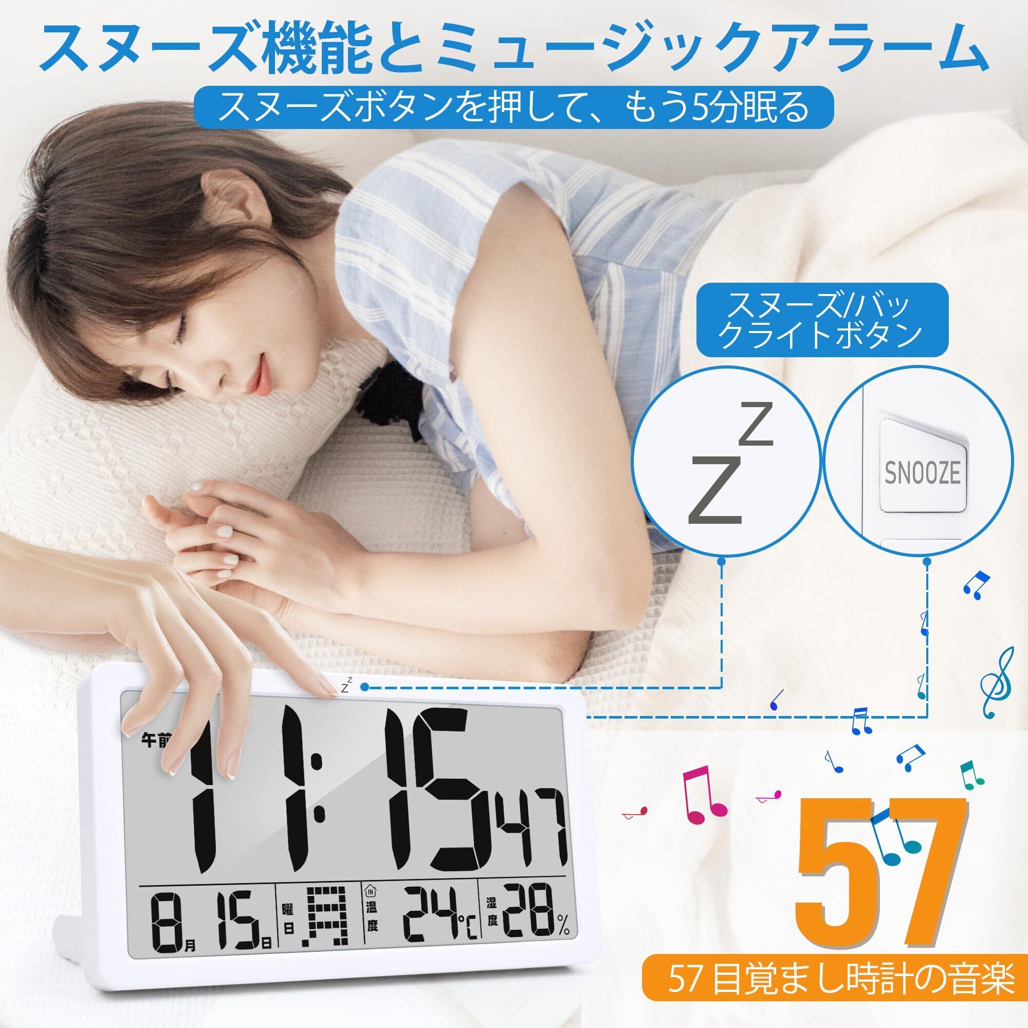 【57 種類のチャイム&スヌーズ機能】デジタルカレンダー時計は、明瞭な音声アラームと高精度な計時機能を備えており、信頼できる目覚まし時計としてお客様にサポートを提供します。目覚まし機能には 9 分間のスヌーズ機能が搭載されており、目覚ましの真上にあるスヌーズアイコンをタップするだけで簡単にスヌーズ機能をオンにすることができ、とても便利です。また、57 種類の音声を用意しており、お客様は異なる雰囲気やニーズに合わせて最適な音声を選ぶことができます。