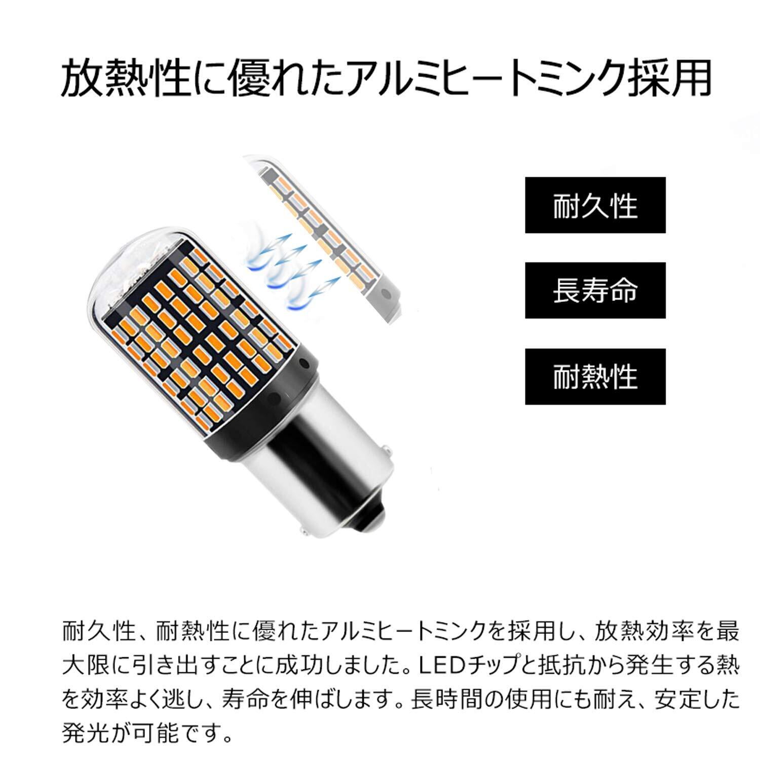 【製品仕様】電球規格:S25s シングル(ピン角度:150° ピン角違い)発光カラー:アンバー(オレンジ) 明るさ:1300~1500Lm(ルーメン) 搭載チップ:3014MD(144連)電圧:DC12V/24V