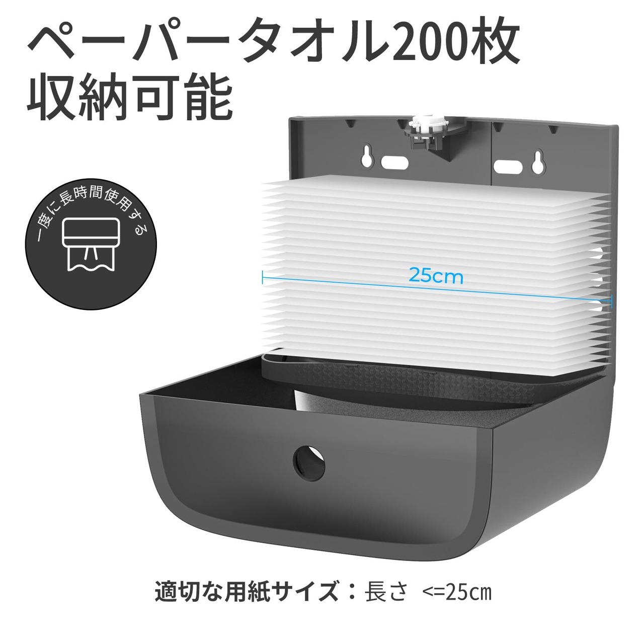 【製品仕様】27.8x10.2x21.5cm。ペーパータオルを200枚収納可能、頻繁に補充する必要がありません。小判・中判Z折りティッシュ用に最適。