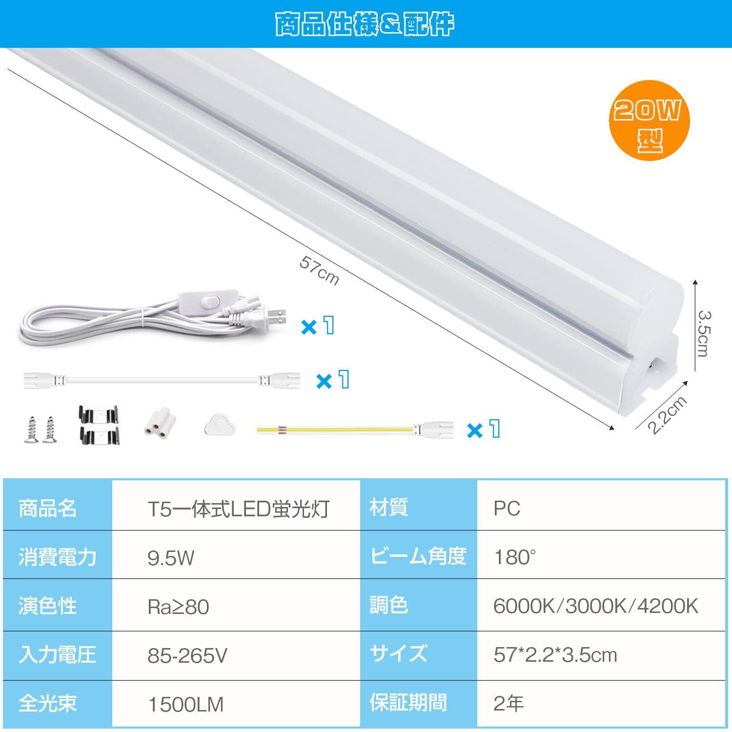 【省エネ&明るい】20W型 1500lm大光量 消費電力9.5W 57長*2.2幅*3.5cm高 Ra≥80 AC85-265V 50/60Hz 180°広配光 1.8M電源コード 動作温度:-20~45℃