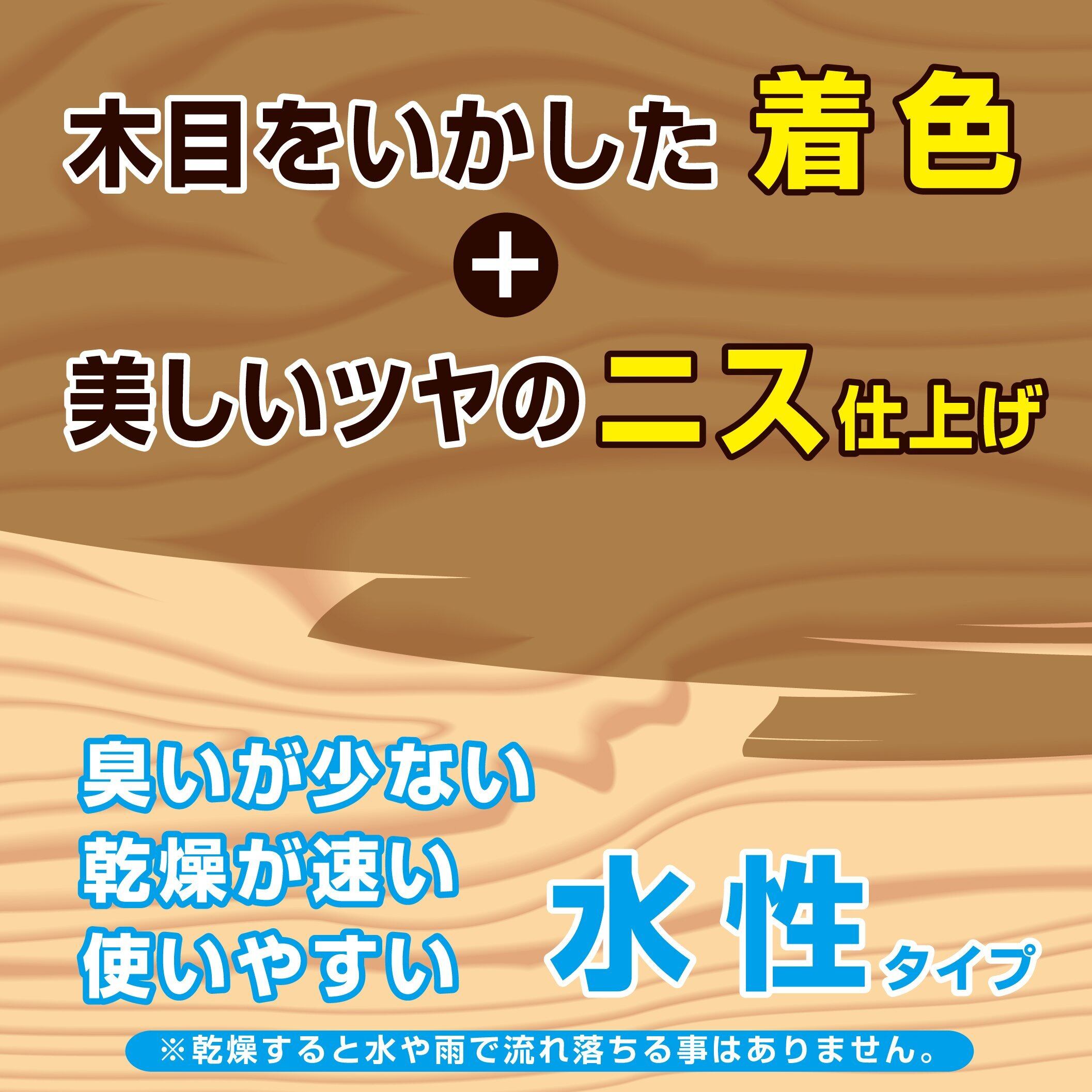 【特長】 ■[使いやすいニス]臭いが少なく、塗りやすい水性ニスです。 ■[下塗と仕上げが一度にできる! ]木目を生かす着色と美しいツヤのニス仕上げが同時にできます。 ■[建築基準法対応塗料:F]シックハウスに対応したFのニスです。 ■[食品衛生法に適合]食品衛生法に適合した、安全性の高いニスです。【塗れないもの・注意事項】表示の用途以外には使用しないでください。 ■[吸い込まない素材]プリント合板 / デコラ板 など ■[特殊な塗装面]UV塗装 / セラミック塗装 など ■[常に水がかかる所]浴室 など ■[その他]高級家具 など【乾燥・塗重時間】【20℃】乾燥時間:約 1.5 時間 塗重時間約 3 時間以上 【冬期】乾燥時間:約 3 時間 塗重時間:約 6 時間以上 【塗り面積(2回塗り)】 100ml:平方メートル:約 0.6 ~ 0.7 m² タタミの広さ:約 0.5 枚分 300ml:平方メートル:約 1.8 ~ 2.1 m² タタミの広さ:約 1.2 枚分【塗装時の注意】 ■[成分が分離・沈殿している場合がある]成分が分離・沈殿していますが、振って混ぜたら塗料性能には問題ありません。 ■[色味は多少異なります]容器の色表示は、中身の色と多少異なる場合があります。また、木の種類・塗り回数によって変わります。※「とうめい」は乳白色をしていますが、乾くと「とうめい」に仕上がります。 ■[色味は多少異なります]乾燥時間 / 塗り面積の表示は、気象条件 / 塗る素材 / 形状 / 塗り方 / 色 / うすめ方などによって多少異なります。 ■[透明は顔料が入っていません]とうめい のみ顔料が入っていません。【うすめ液・用具の洗浄】 水 (塗りにくい時は5%以内でうすめてください。)