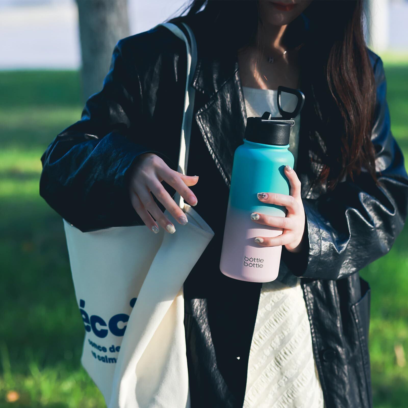 BOTTLE BOTTLE 1リットル 水筒 1L ステンレス ウォーターボトル 子供 直飲み ストロー付き 保温保冷 二重構造 真空断熱 持ち運び アウトドア 女の子 ブルー&ピンク | BASE SHOP