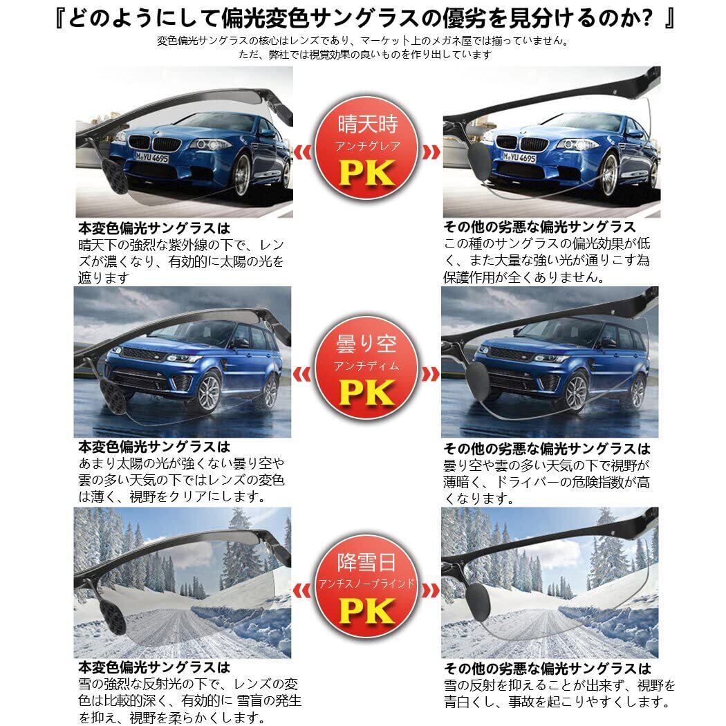 ➤【高速調光】調光レンズとは太陽光の紫外線の強弱によって変色します。晴天時の場合、強烈な紫外線よってレンズの色が濃くなり、有効的に私たちの目を太陽の強い光から守ってくれます、雲の多い天気の場合、やや光が抑えめになりレンズの色が若干薄めになることで、視野の明るさを確保し、事故を防ぎます。