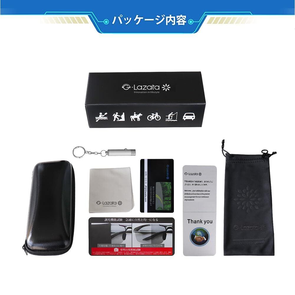 ➤【ご注意】調光レンズとは太陽光の紫外線の強弱によって変色しますので、社内、室内、曇り空など紫外線の弱いでは変色調光が弱くなることを予めご了承ください。調光効果につきましては付属の紫外線照射灯(ブルーライト)とテストカードにてご確認ください。