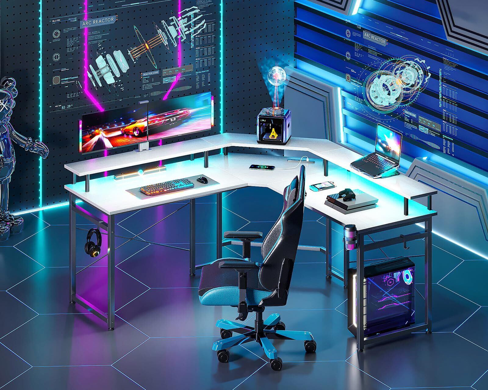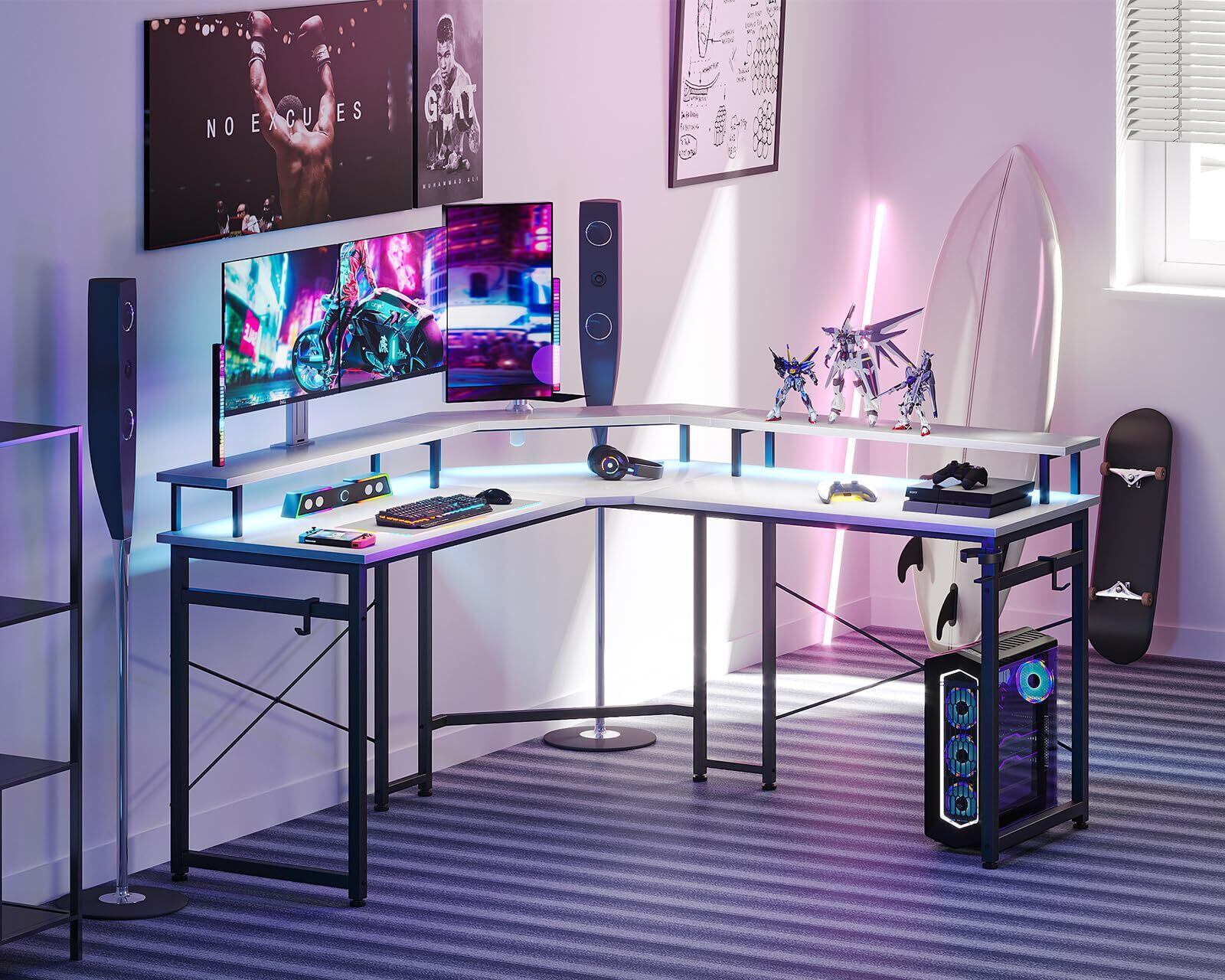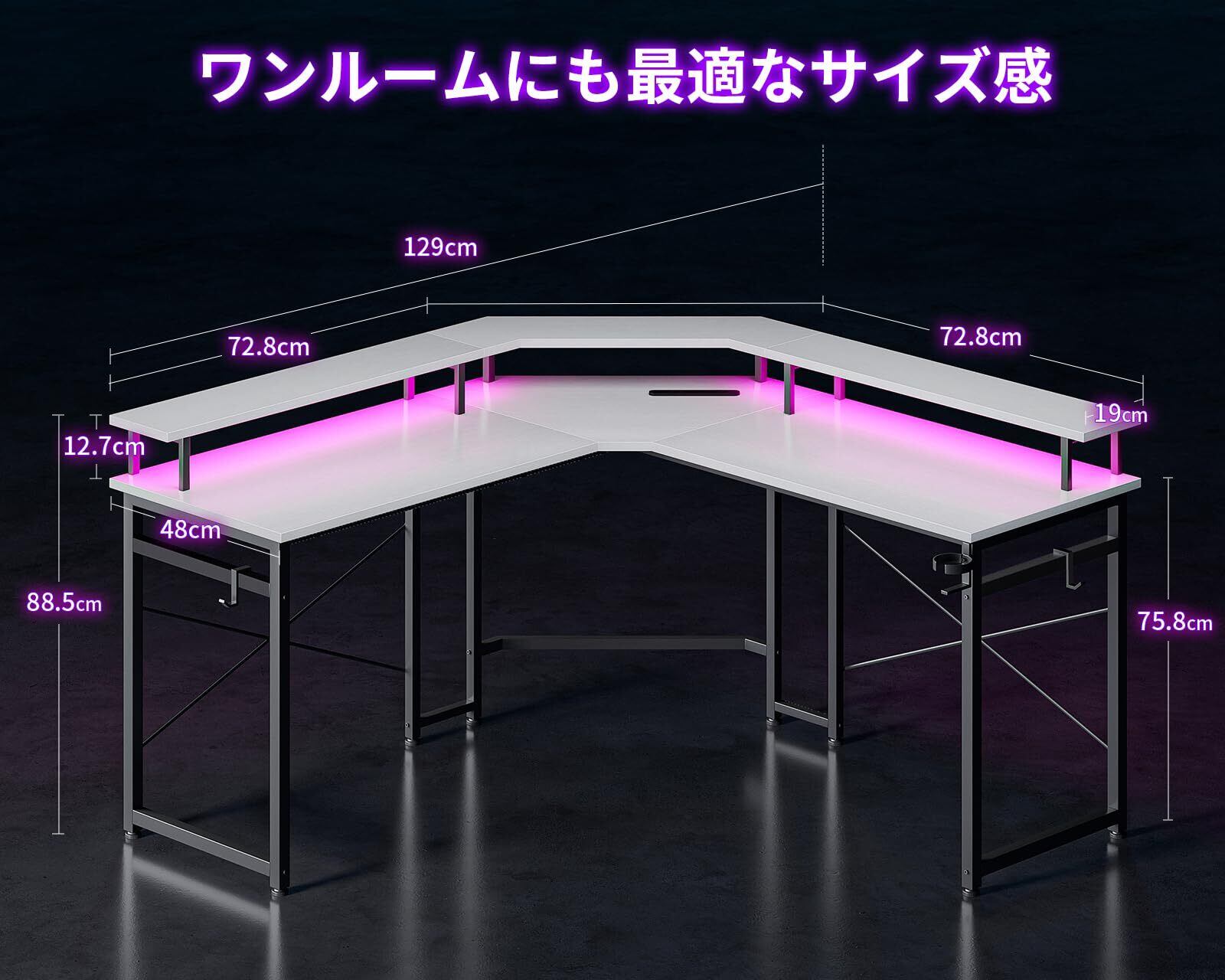 ODK ゲーミングデスク コンセント付き パソコンデスク 机 幅129 収納 desk 仕事用 l字デスク 在宅勤務 組立簡単 ホワイト