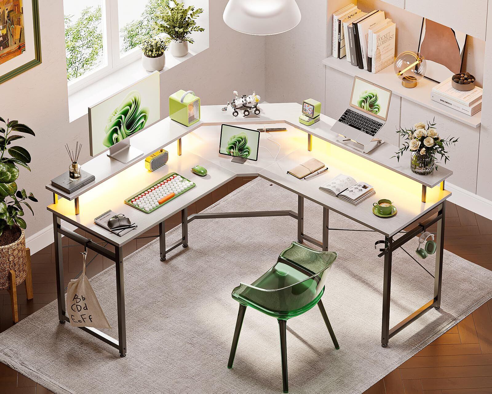 【コンセント付きL字デスク】机には、2つのACコンセントとUSB ポート付きで、パソコンやスマホなどの充電ができて超便利です。デスクの上には一体型のモニター台が備え、利用時に目線をあげて姿勢を改善し、首や肩への負担を軽減!長期間のeスポーツゲームもテレワークも快適に!広々の天板で、圧迫感なく作業効率も格段に上がります。ヘッドホンフック、ドリンクホルダーあり、ゲームと作業スペースがアップ、もっと楽に楽しめます。