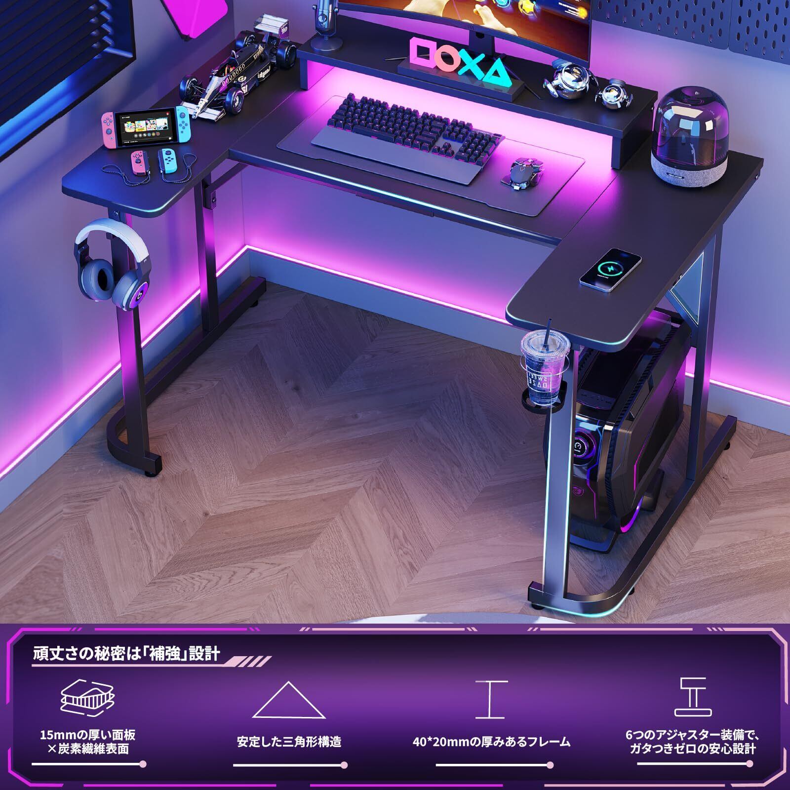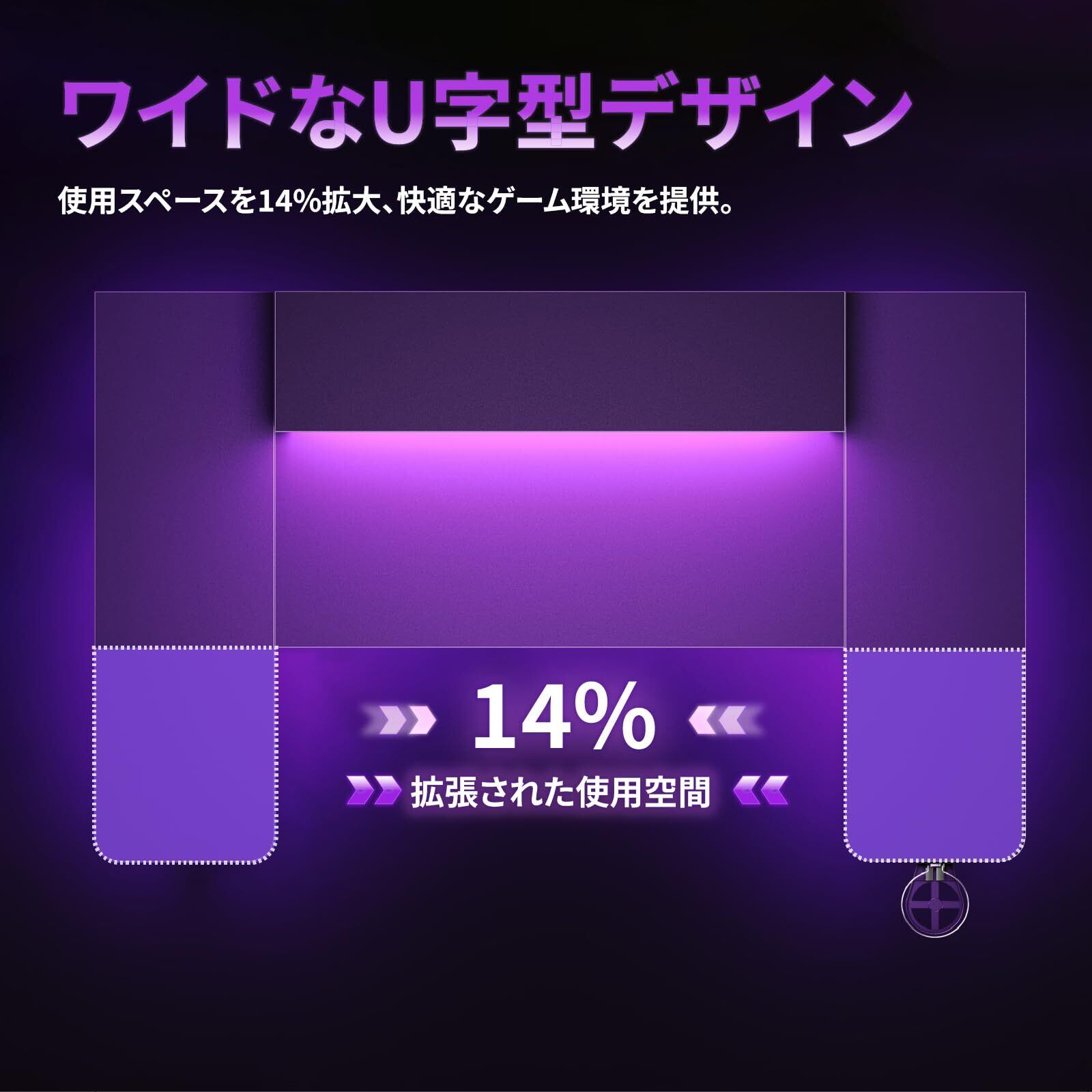 特徴 革新なU型ゲーミングテーブル, LEDライト付き・リモコン操作, カップホルダー、フック、モニタースタンド付き, 内蔵モニタースタンド