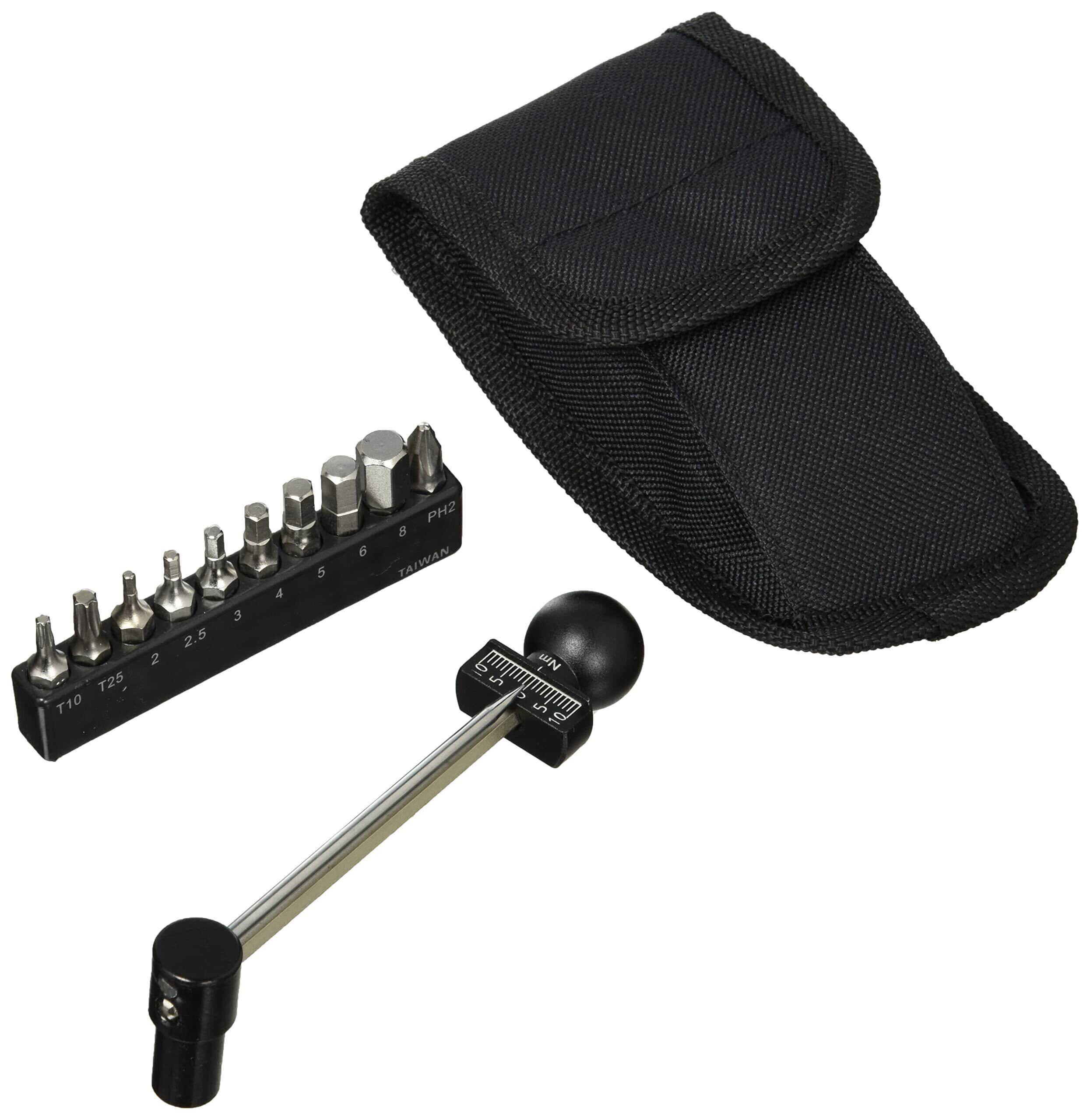 手のひらサイズの携帯型の簡易トルクレンチ。3/4/5/6/8/10mmのヘックス、T20/T25/T30のトルクスのビットが付属します。