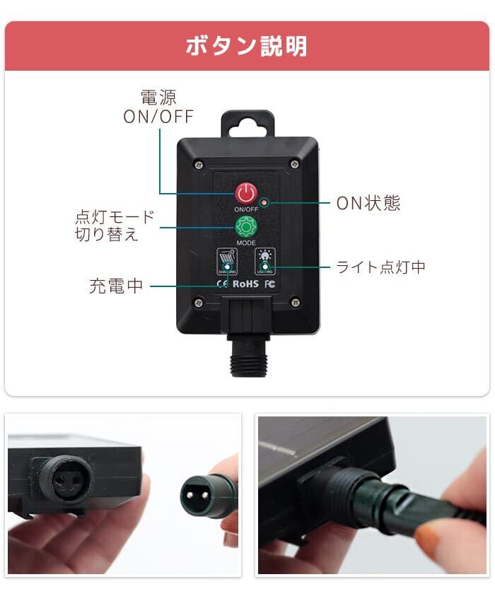 【大容量バッテリー】他社にない1800mAhバッテリーを採用。LED200球、長20M(電源コード2M、合計22M)、点灯モード8種類、IP65防水、ソーラー充電式