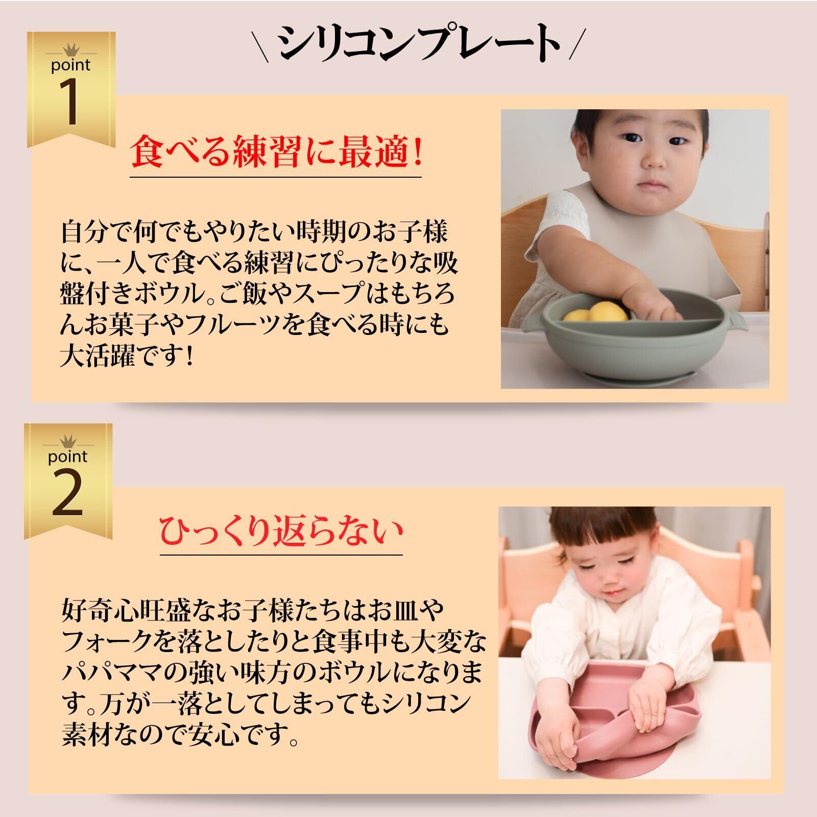 ・お食事中に食器をひっくり返してしまうことや落として割ってしまう心配がない、安心・安全な吸盤付きのシリコン製プレート。