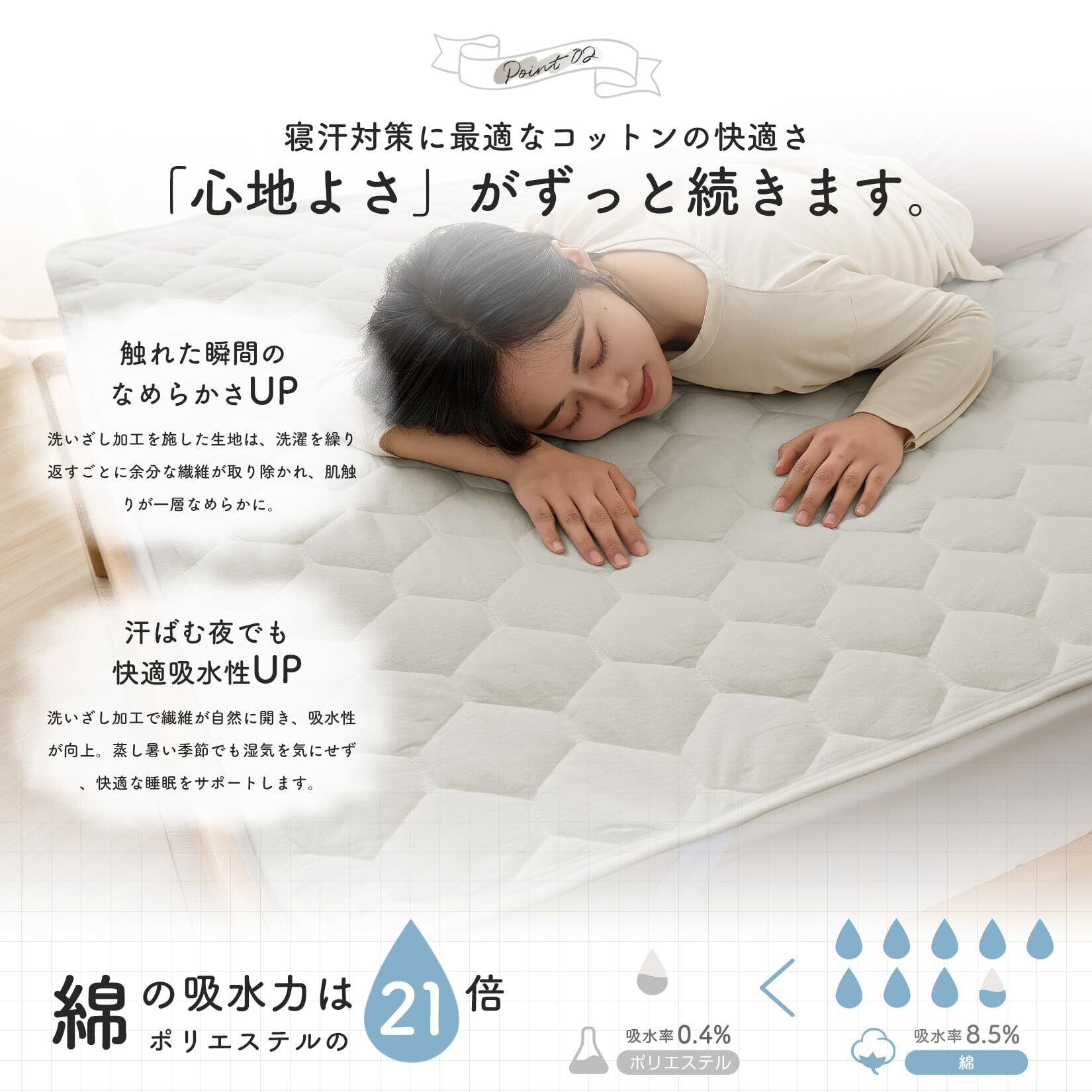 【寝汗対策に最適なコットンの快適さ】日本紡績検査協会「ボーケン」によると、綿の吸水力はポリエステルの21倍!化学繊維が多く使われている今だからこそ、吸水力抜群の「綿素材」による心地よさを感じてください。