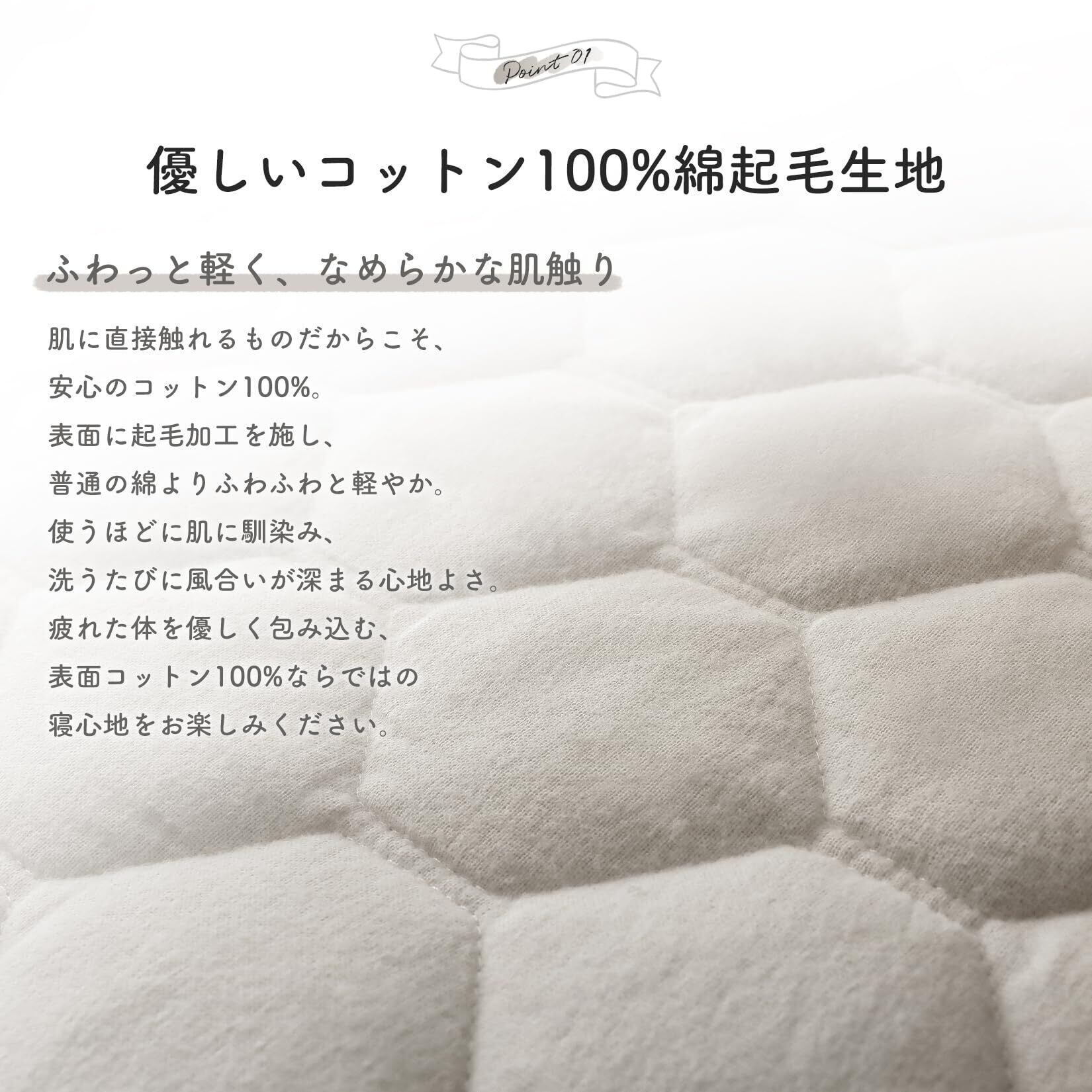 【ふんわりと優しいコットン100%生地】肌に直接触れるものだから、安心のコットン100%。表面に起毛加工を施し、普通の綿よりもさらにふわふわ。タオルのようなざらつきがなく、寝返りを打っても肌に優しく、快適な触感が続きます。最初から肌に馴染みやすい、しっとりとした素材感が魅力です。