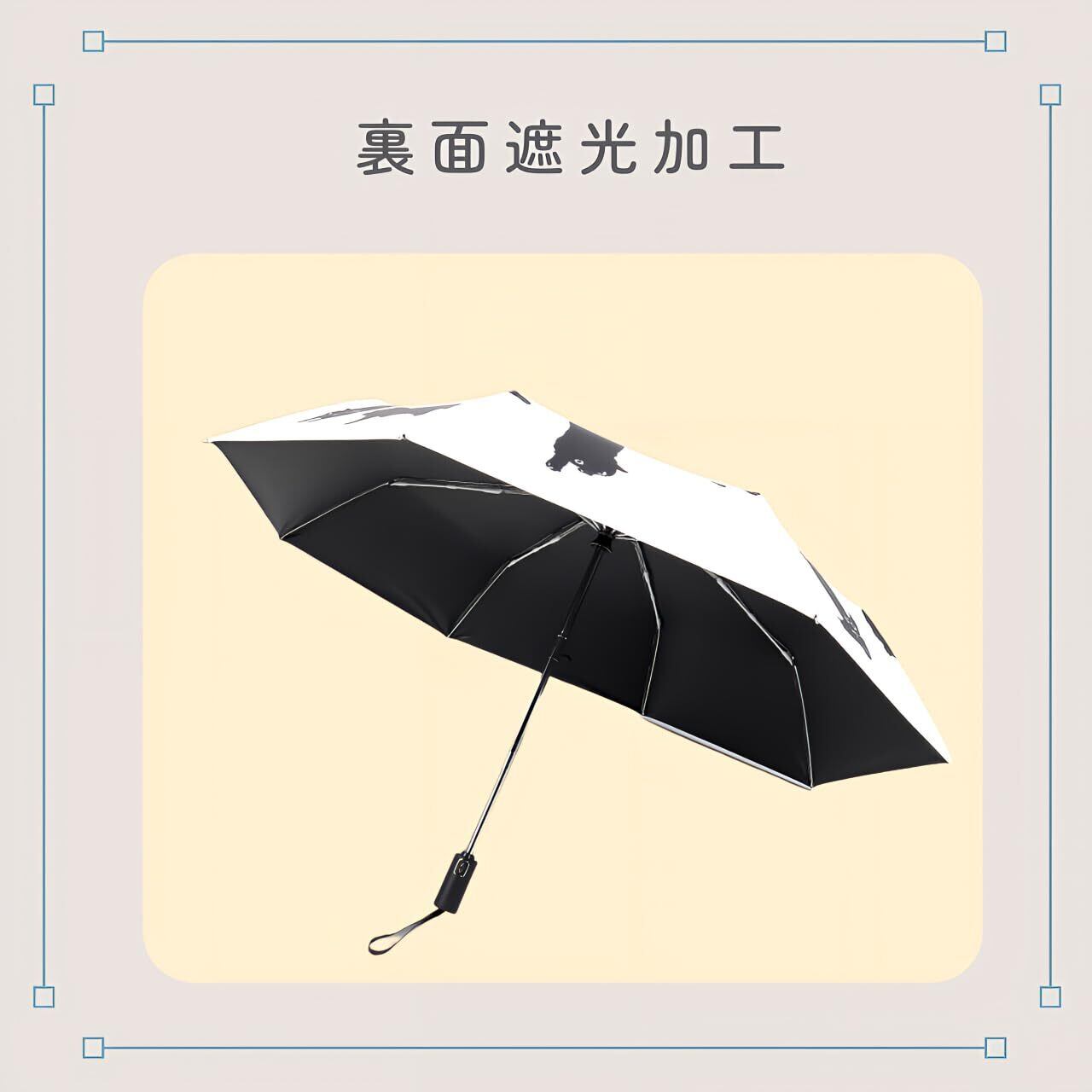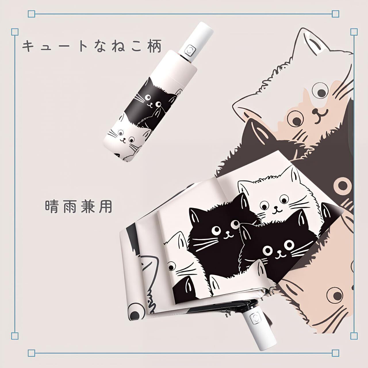 【傘の機能とデザイン】可愛らしい猫のプリントが施された折りたたみ傘、雨の日のお出かけでも明るい気分にさせてくれます。収納ポーチが付属して便利です。自動開閉機能付きのタイプはワンタッチで簡単に開閉が行えます。