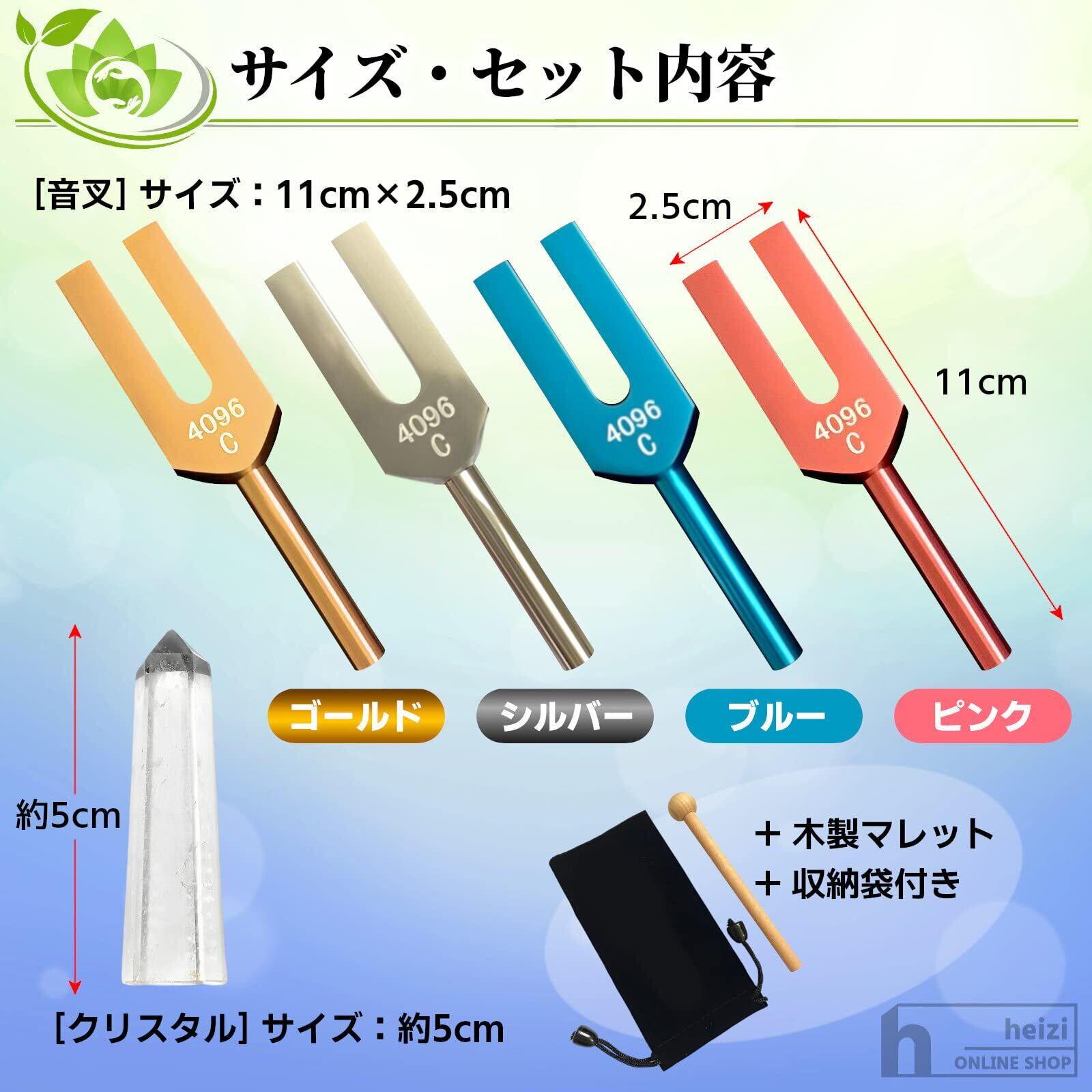 【セット内容】[音叉]サイズ:11×2.5cm カラー:シルバー/ブルー/ピンク/ゴールド [クリスタル]サイズ:約5cm 木製マレット、収納袋付き