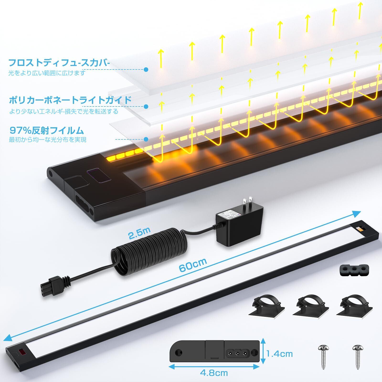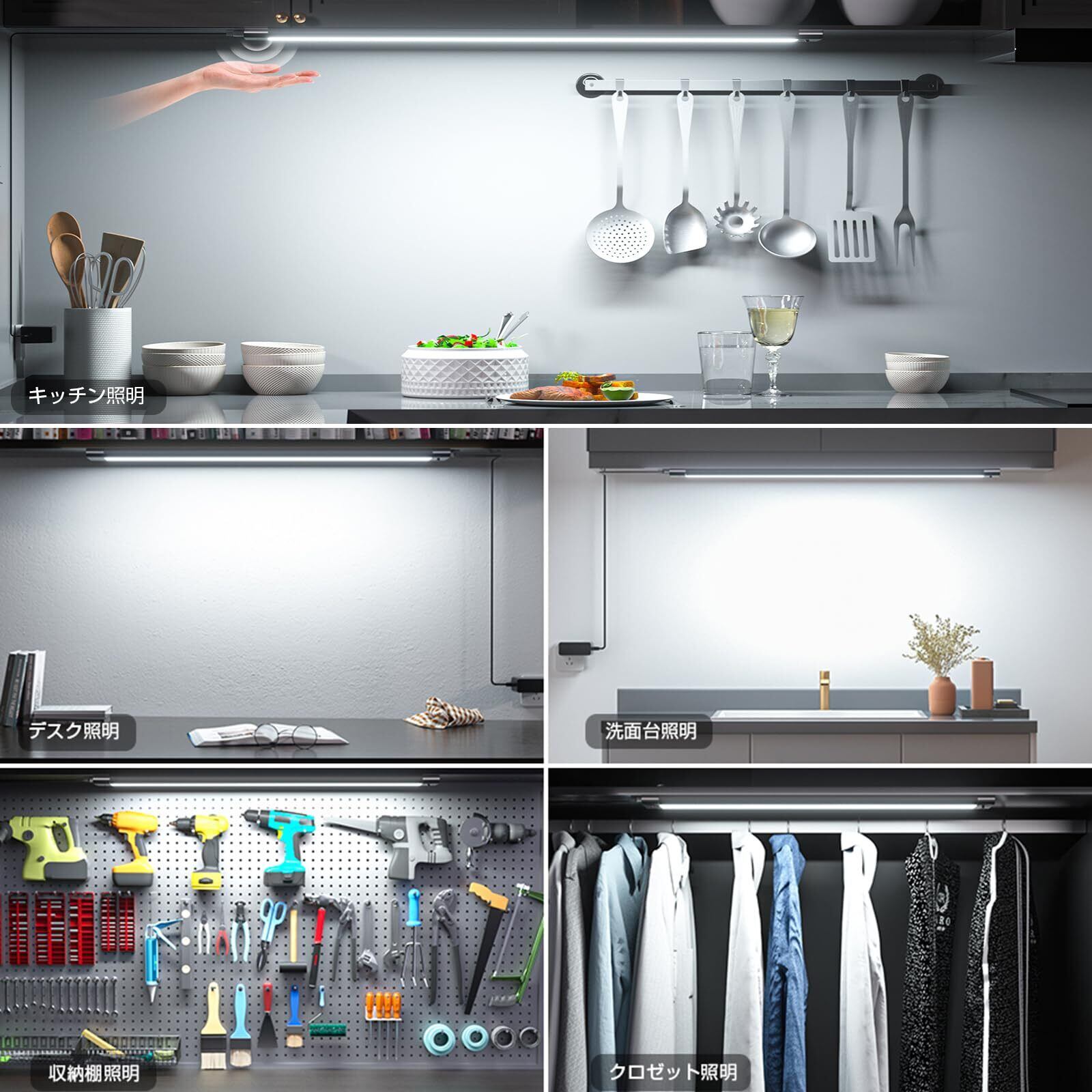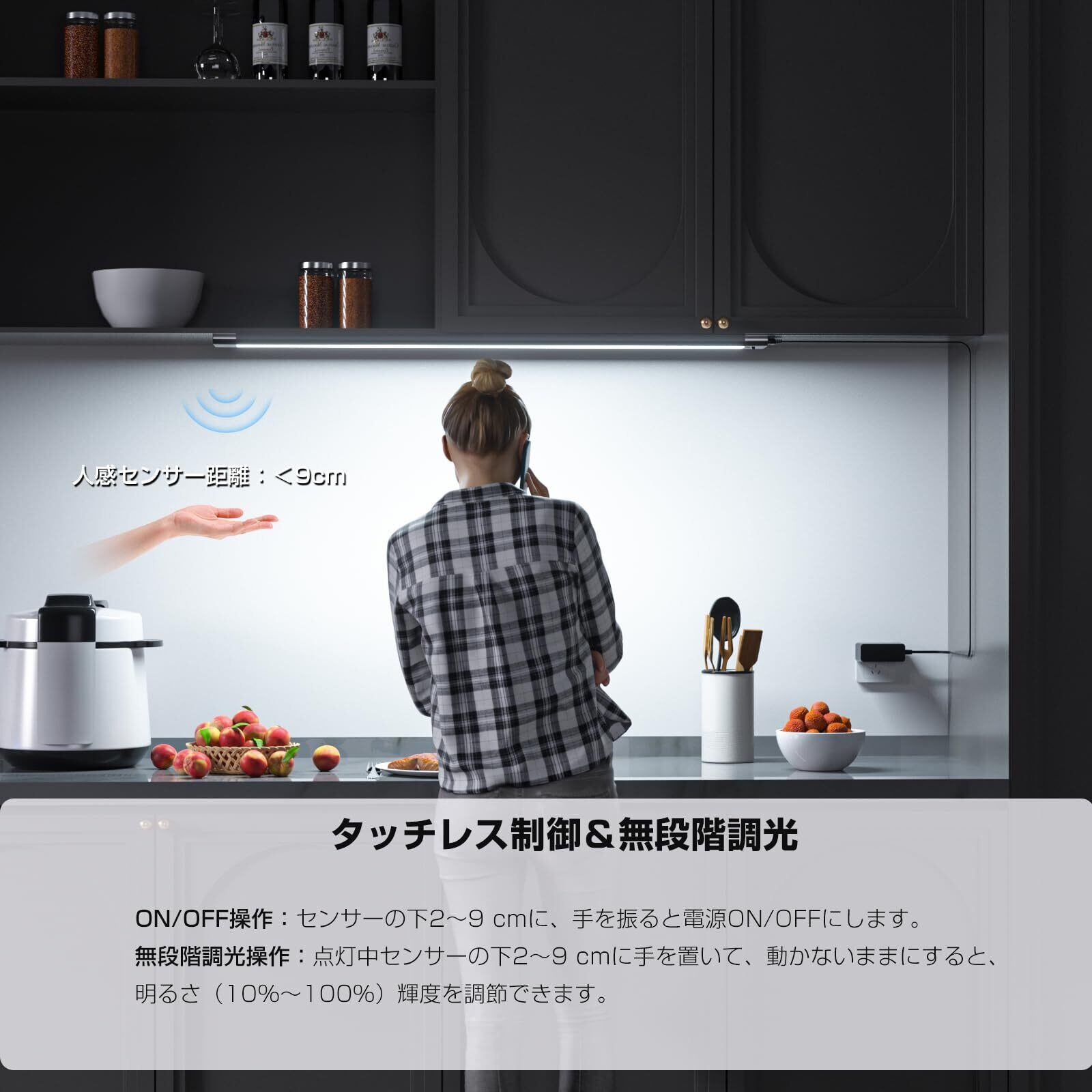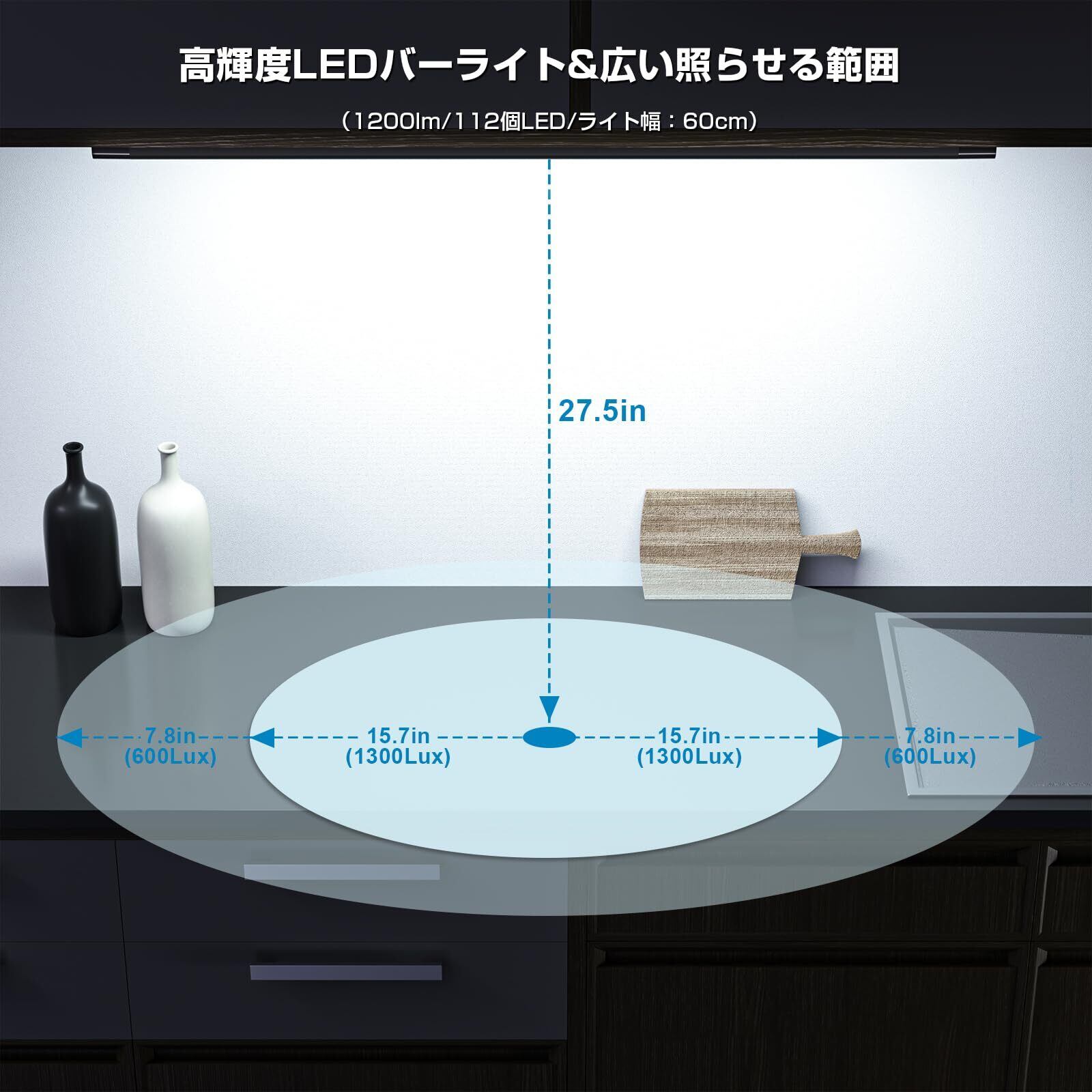 WOBANE LEDキッチンライト 60cm バーライト 流し元灯 調光調色 タッチレスセンサー 1200lm 工事不要 棚下・ キャビネット照明 led 間接照明 キッチン 洗面所 台所 省エネ 手元灯 PSE認証済 ブラック | BASE SHOP