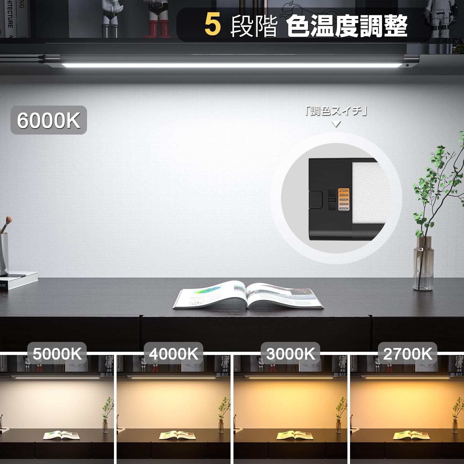 【調光調色で快適な光環境】5段階の調色機能で、2700Kの電球色から6000Kの昼光色まで、料理や読書、リラックスタイムなど、シーンや気分に合わせて色温度を簡単に切り替え可能。さらに、無段階調光で好みの明るさに調整でき、快適な光環境を実現します。