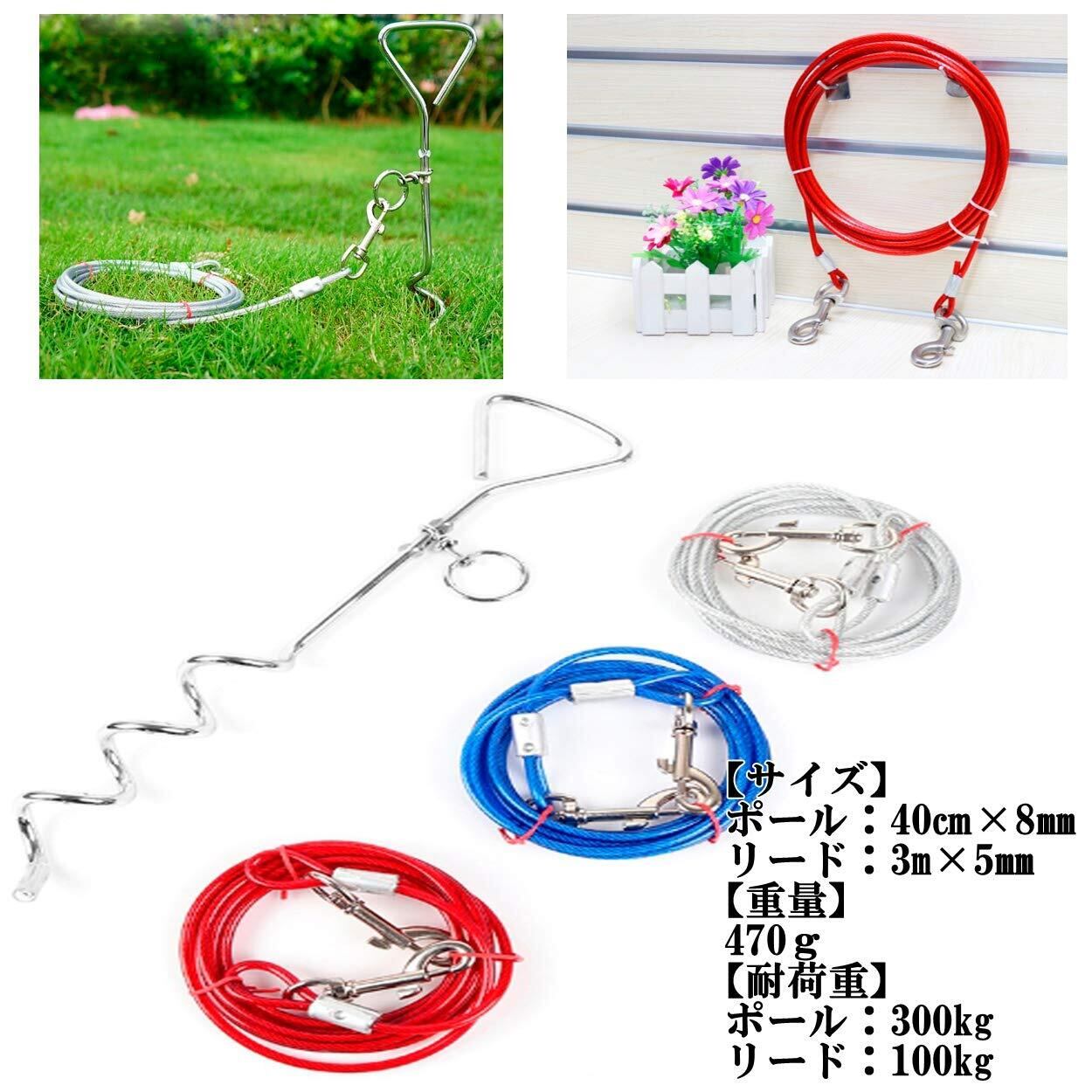 【カラー】ブルー・シルバー・レッド 【サイズ】ポール:40㎝×8㎜ ワイヤー:3m×5㎜ 【重量】470g 【セット内容】係留ポール×1、ワイヤーリード×1