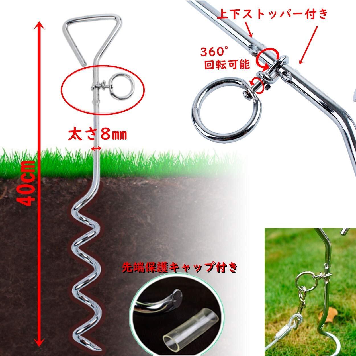 公園などのお散歩や、アウトドアキャンプ、BBQなど、屋外で一時的に係留しておくための係留ポールとスチールワイヤーロープです。