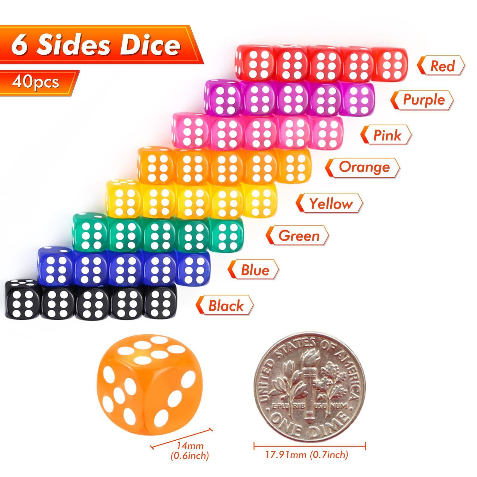 【ダイスカラー】レッド、黄色、ブルー、グリーン、紫色、オレンジ、ブラック、ピンク。ダイスサイズ:14mm*14mm*14mm ;パッケージ内容:40個