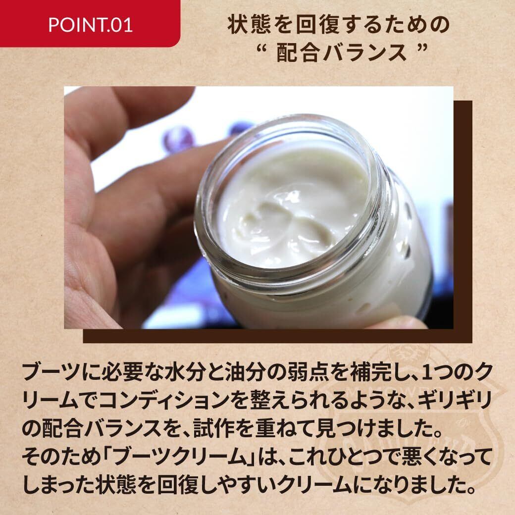 カルナバワックスとオイルを配合したエイジングをたのしむブーツのためのケアクリームです。経年変化した革の風合いを残し、あえてスレ傷を活かした「無骨なエイジング」をたのしみたい方にはエンジニアブラック、ブラックチェリー、シガーブラウンがおすすめ。革の色抜けや茶芯のエイジングをたのしみたい方にはニュートラルがおすすめです。補色、栄養、ツヤ出し効果がありながら、革の吸湿性や通気性にはほとんど影響しないクリームです。 用途:一般的な表革、オイルドレザー、クロムエクセルレザー、ホースハイドなどの靴、ブーツ 使用方法:塗布用のブラシや布(コットンなど)にクリームを少量取り、靴に塗り込みます。豚毛ブラシでブラッシングするとツヤが出やすくなります。最後に布(クロスなど)で乾拭きすると自然なツヤが出てきます。※靴は汚れが付きやすいため数回に1度クリーナーで古いクリームや汚れを落としてからご使用ください。 注意:・使用後は完全にフタを閉めて保管してください。・シミ、色ムラができる、変色する特殊な皮革もあるため、目立たない部分でテストしてからご使用ください。