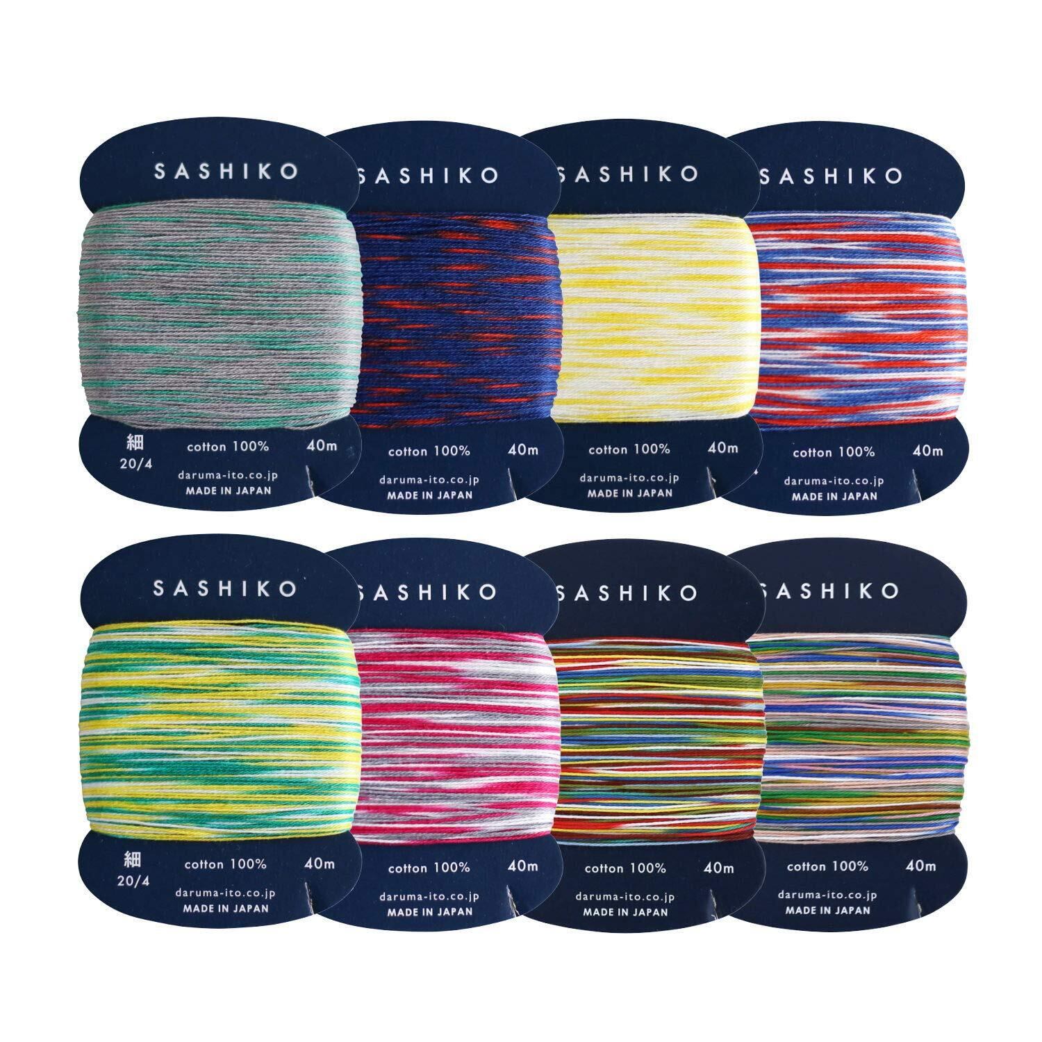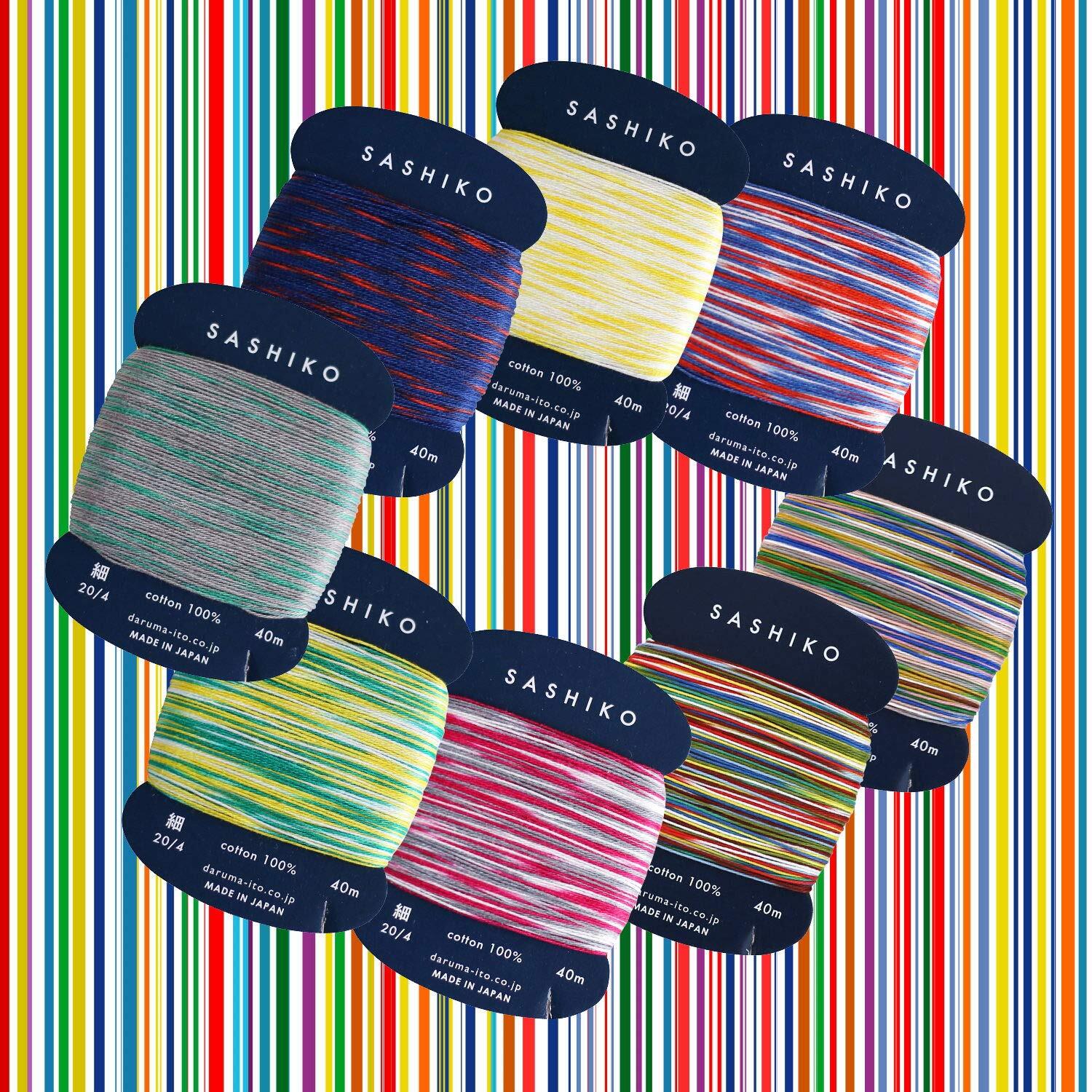 ※パッケージはダルマ製ではありません。従来の刺し子糸に複数の色を配色したカスリ染め。ダルマブランドの技術を用いて綺麗な配色にしあがりました。全8種類を可愛いパッケージに入れてお届けします。。