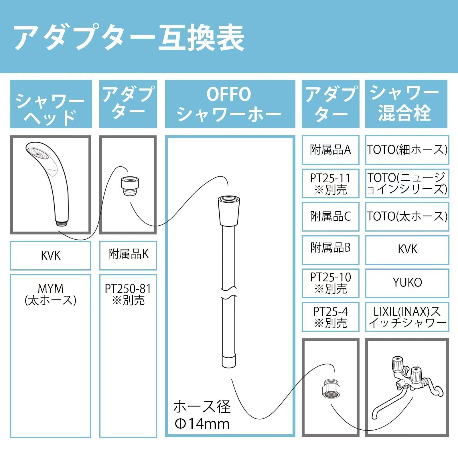 [適用するシャワーヘッドメーカー] 本品とシャワーヘッドを接続する側のネジサイズはG1/2です。OFFO、TOTO、LIXIL(INAX)※バランス釜除外、SAN-EI、カクダイのシャワーヘッドに直接取付できます。一部シャワーヘッドはネジサイズは合いますが、ヘッド根元のo-ringが邪魔になって接続できない可能性があります。その場合、シャワーヘッド根元のo-ringを取り外してください。o-ringを取り外した後に、水漏れが発生する場合、付属のパッキンを追加してく見てください。本品はKVKのシャワーヘッド用アダプターが付属しておりますが、KVKシャワーヘッドに取付る場合、アダプターKをお使って接続してください。