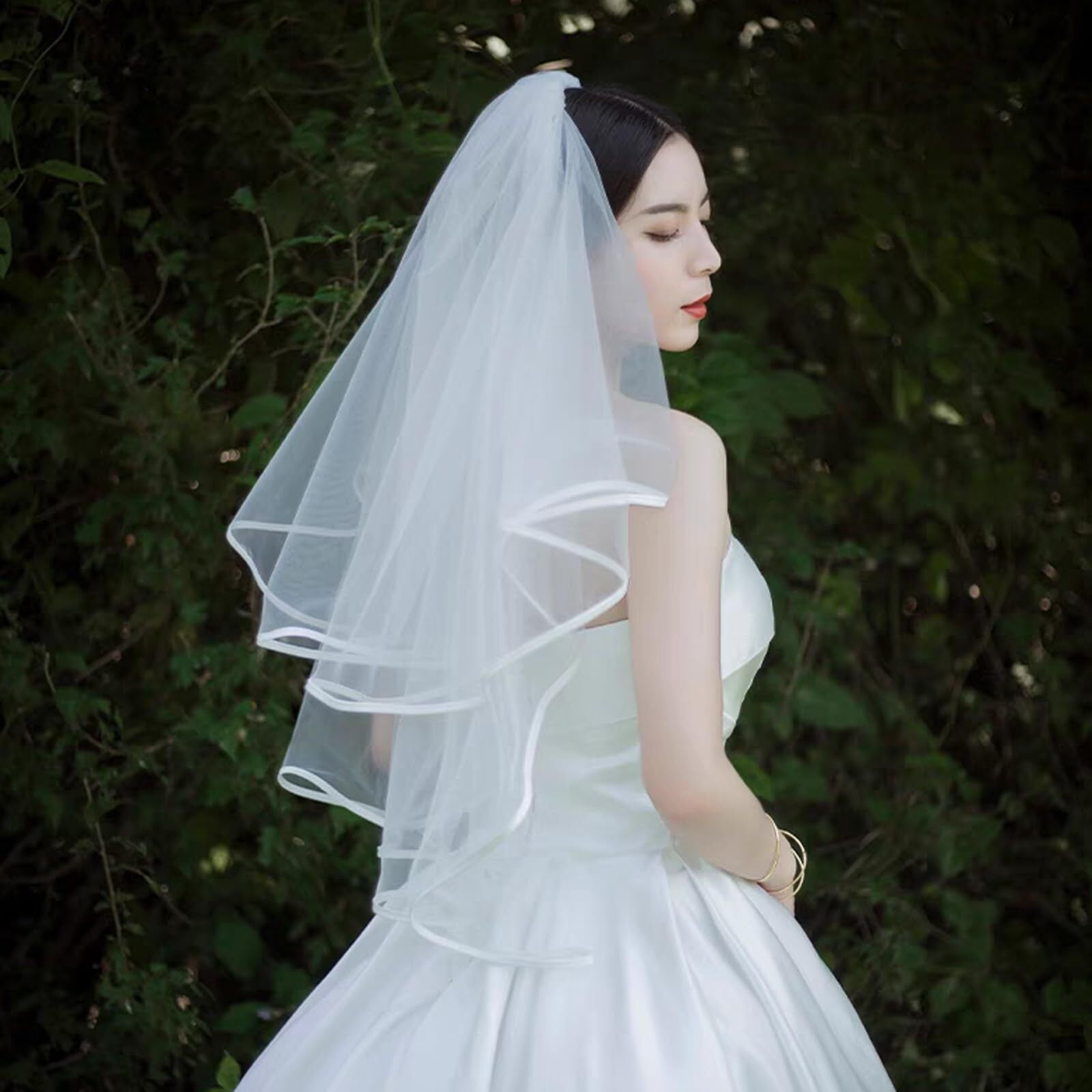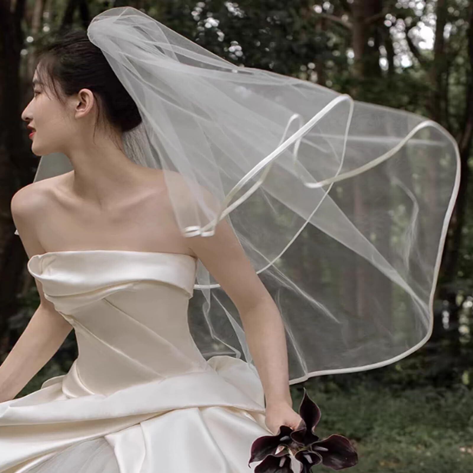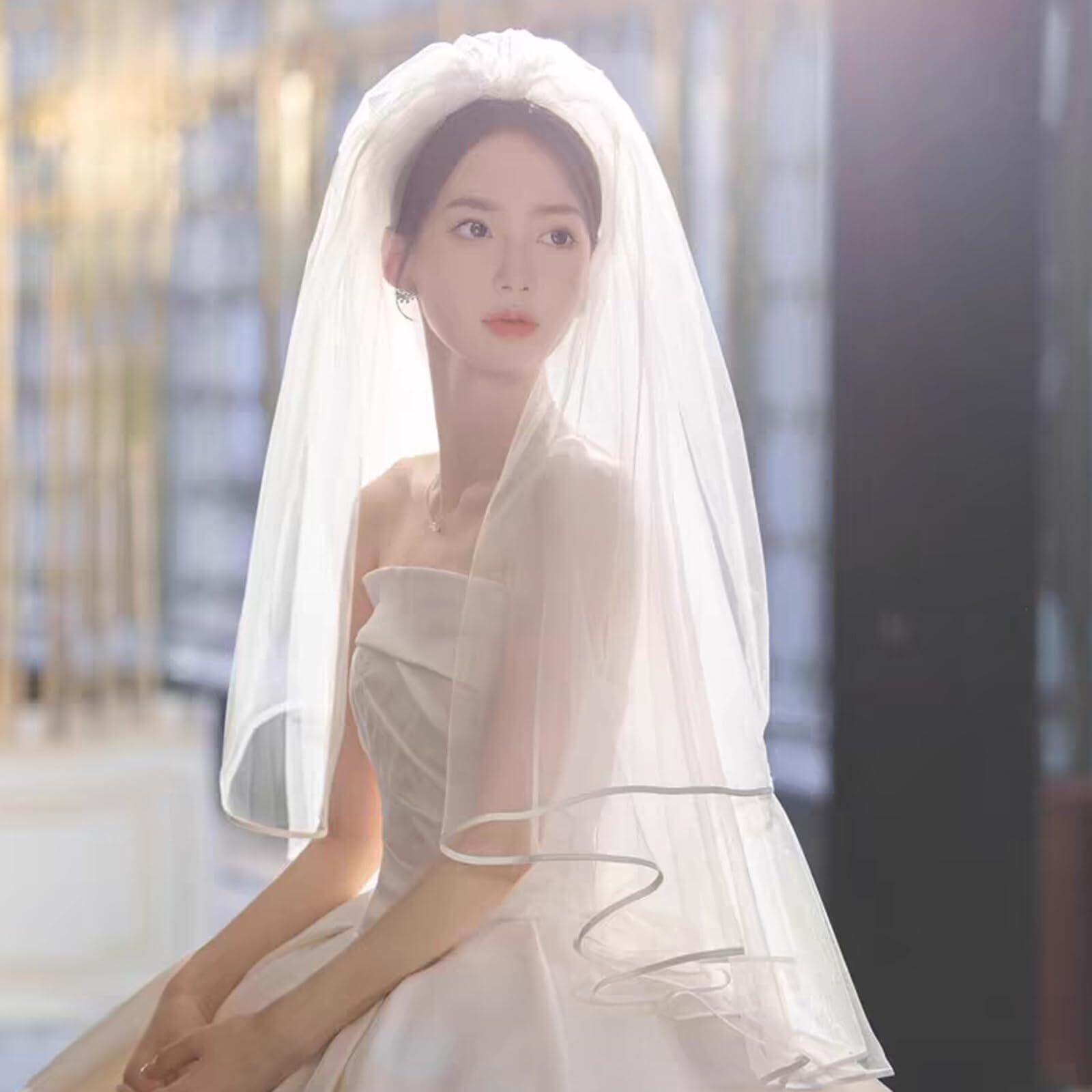 花嫁ベールはシンプルなデザインで、神聖なイメージがあり、きれいな印象を与えます。2層ベールの縁は繊細で柔らかく軽く、とても心地よいです。 1層目は約60cm、2層目は約80cmで、シンプルで完璧なブライダルティアラです。 ヘッドは、ヘッドへの負荷を軽くするのに十分なほど軽いです。