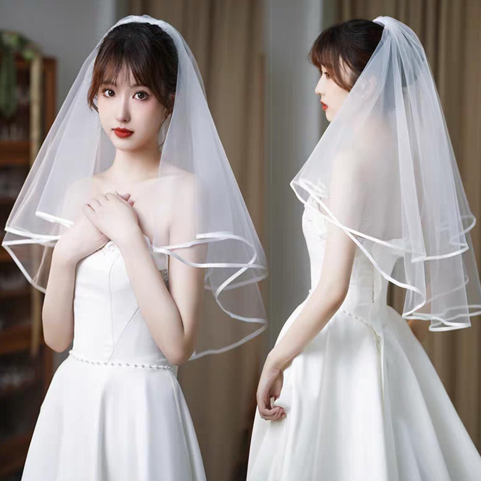[KQHOMEI] ウエディングベール 花嫁ベール レース花 ショートベール 二段ベール コーム付き 金糸入りウェディング波打つ縁エッジ櫛付き 写真 かわいい 蝶結び付き ラインストーン | BASE SHOP