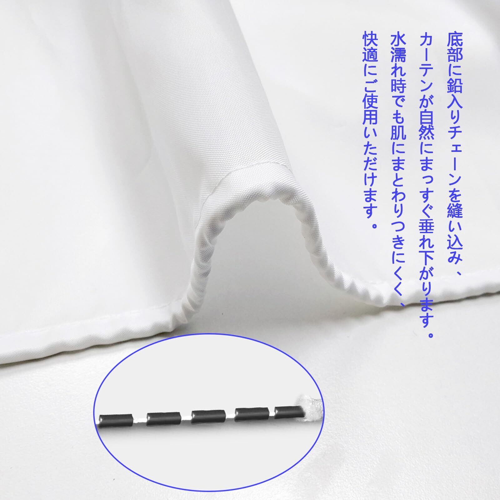 【チェーンウェイト加工】シャワーカーテンの底に鉛のチェーンウェイト入り、自然にまっすぐつり下げされる、シャワー中にカーテンが体にくっつかなく、ドレープ性がよい。