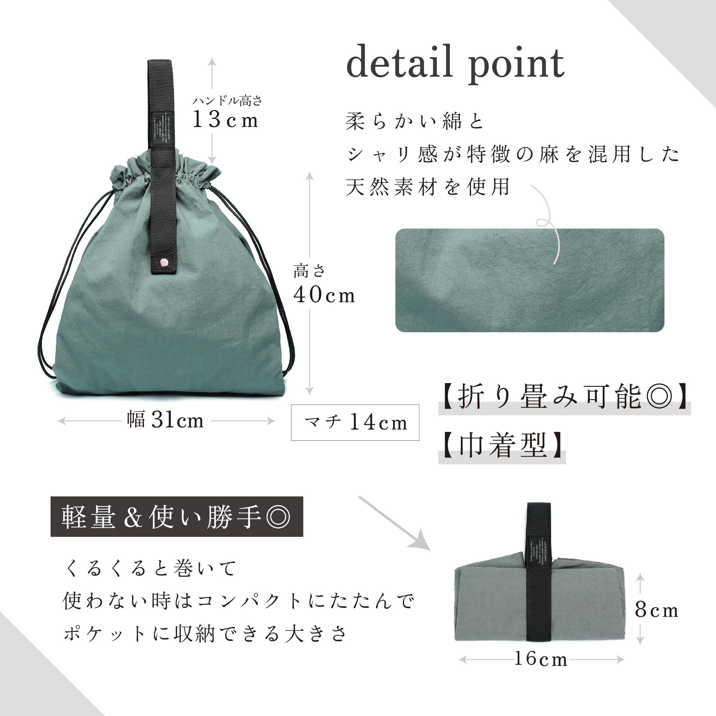 ①綿麻素材を使用し綿の持つ柔らかさと麻のもつ独特のシャリ感が特徴です。 ②色もアースカラーでナチュラルテイストに仕上げました。 ③コンビニやちょっとしたお買い物の時に便利なサイズになっています。④巾着型なのでコンビニ弁当を入れても傾きにくくなっています。 ⑤普段使いしてもかわいいデザインになっています。