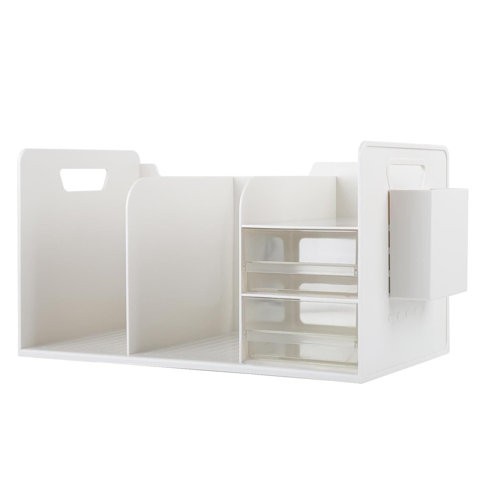 ELECTRO-WEIDEWORLD 卓上収納 組み立て不要 デスク上置き棚 ペン立て付き 引き出し 大容量 デスク 整理 卓上ラック デスクオーガナイザー 机上ラック 本立て 本棚 desk organizer A4フォルダー/新聞/雑誌/書類/事務用品/文具用品収納 分類収納 (ホワイトB-透明引き出し) | BASE SHOP