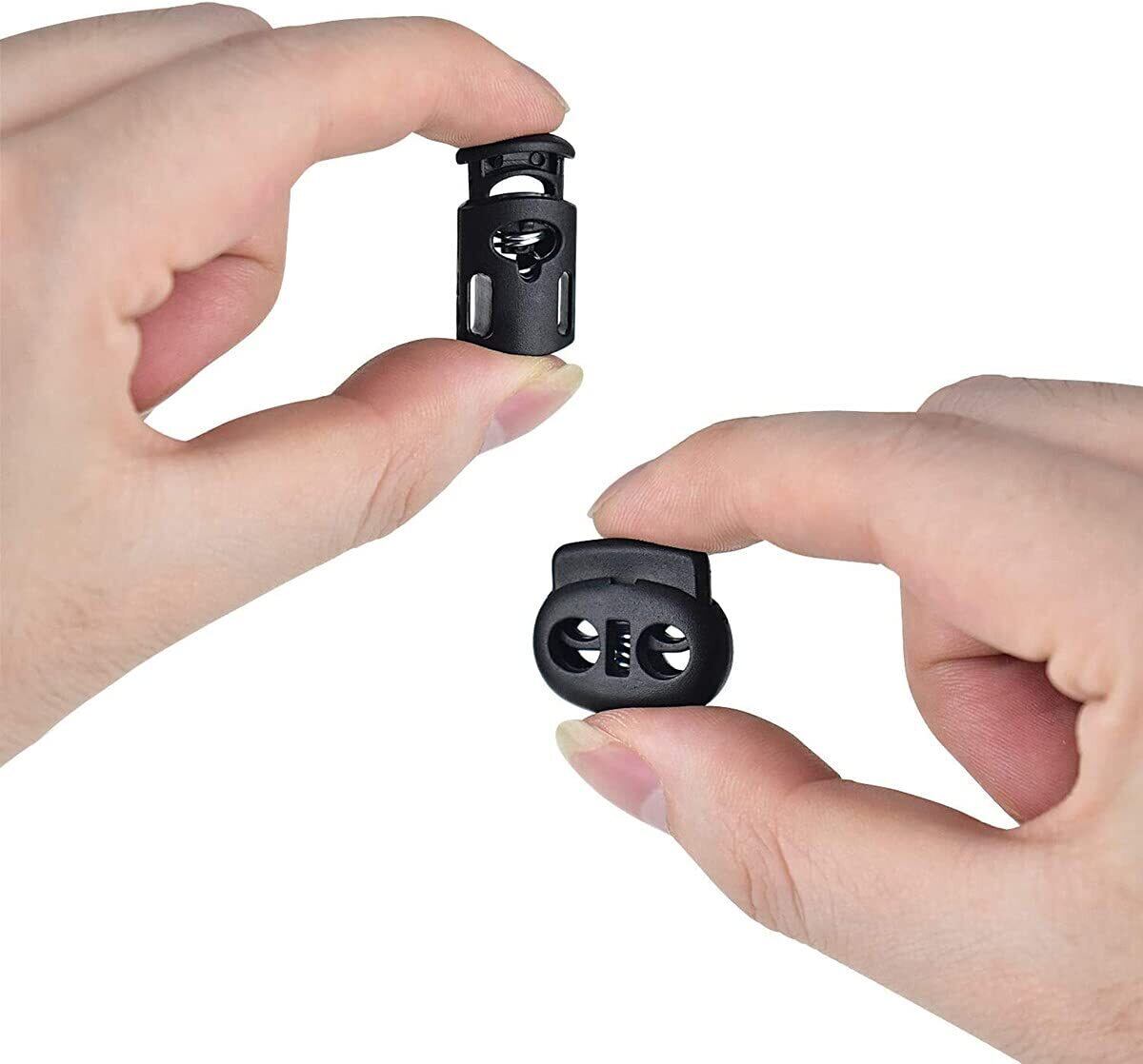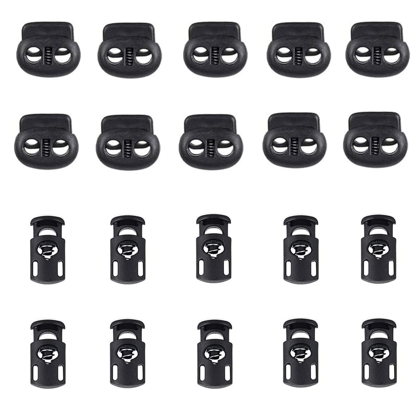 スプリングコードストッパー 20個入り(丸型 2つ穴×10+樽型 1つ穴×10)プラスチック製コードロック 紐止め 穴径約6mm 交換 補修用 靴ひもに アウトドア用