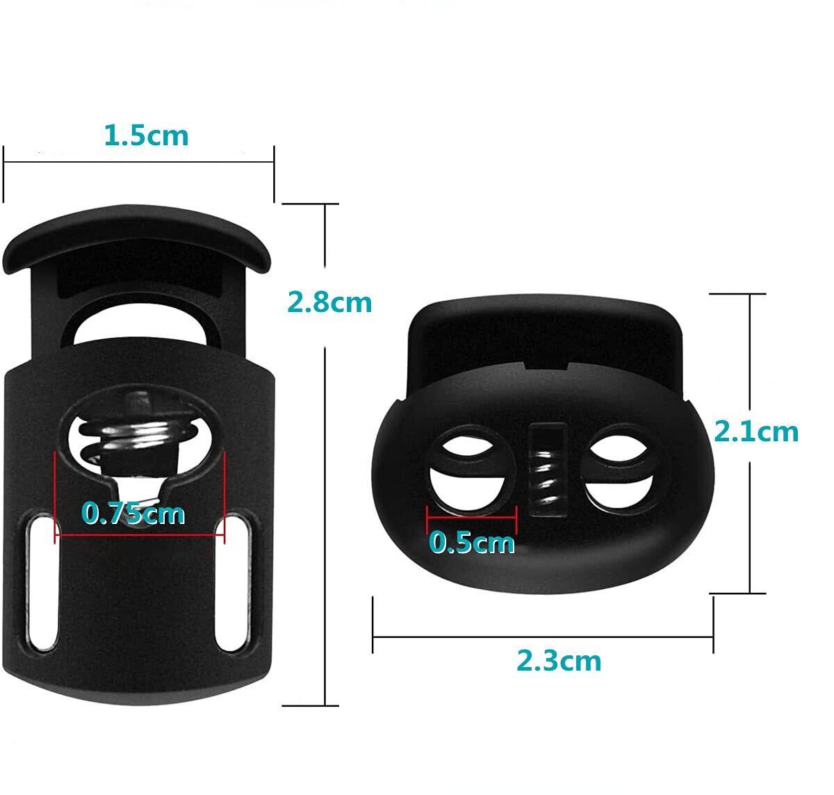 仕様:丸型スプリングコードストッパー20個(丸型 2つ穴×10+樽型 1つ穴×10), サイズ:丸型:2.1cm*2.3cm,樽型:2.8cm*1.8cm,穴の直径:6mm。素材:プラスチック, 色:ブラック。