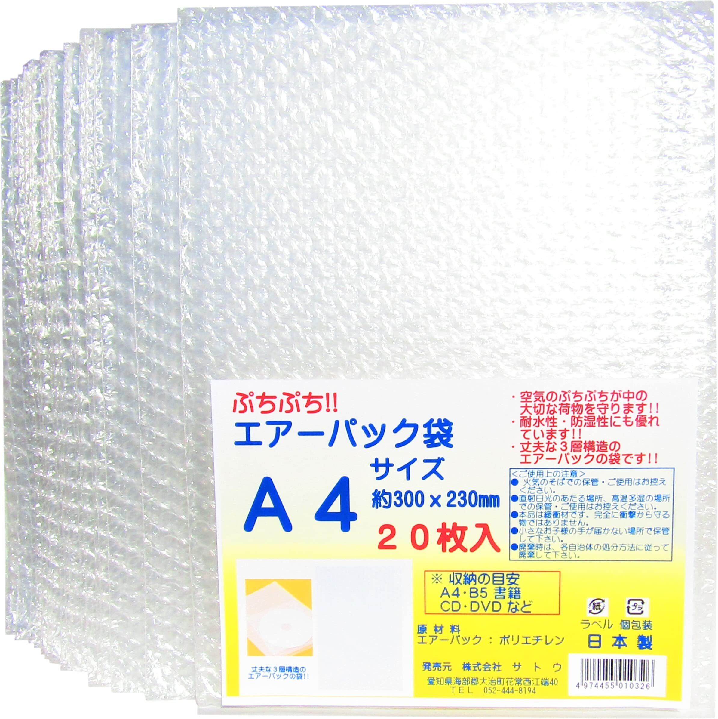 サトウ 日本製 エアーパック 袋タイプ 約縦30cm×横23cm×厚み5mm A4サイズ が入る 20枚入 ぷちぷち 緩衝材 透明 割れやすいものに 包装 梱包用