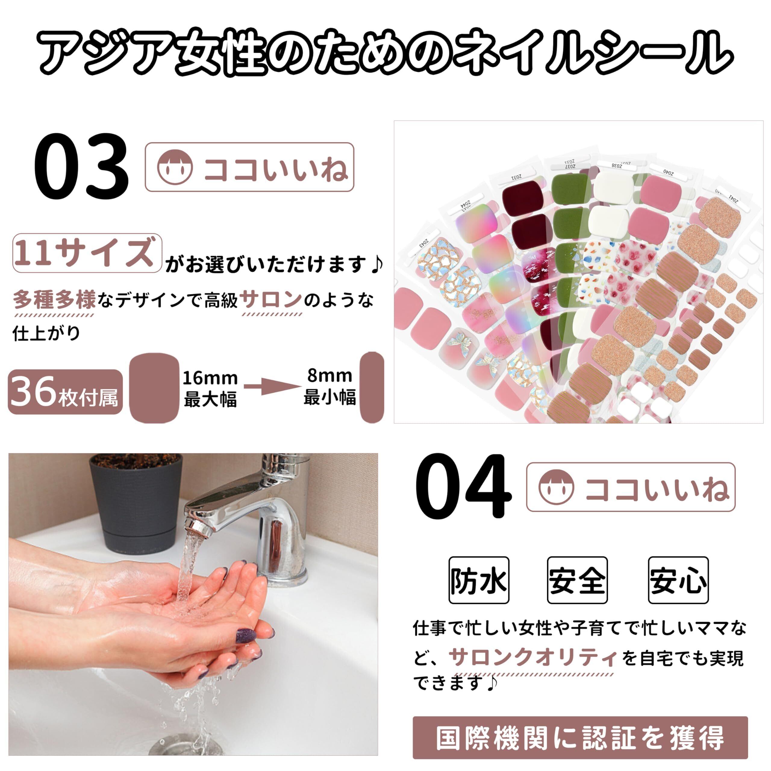 ▶【サロン級に仕上がるジェルネイルシールを体験して】最新の設計で様々おしゃれなデザインのフットネイルシールをお客様に向け!特殊技術によりネイルシール裏全面にECOのジェルリキッドでを埋め込んでいます。一般のネイルシールは耐久性がただ3日だけ続けますが弊社のサロン級に仕上がるジェルネイルシールーは10-14日続け可能になりました。(※足爪の状態や生活習慣によって持ちは異なります)また弊店は100種おしゃれなデザインを超え、あらゆる年齢層も活躍するデザインです。