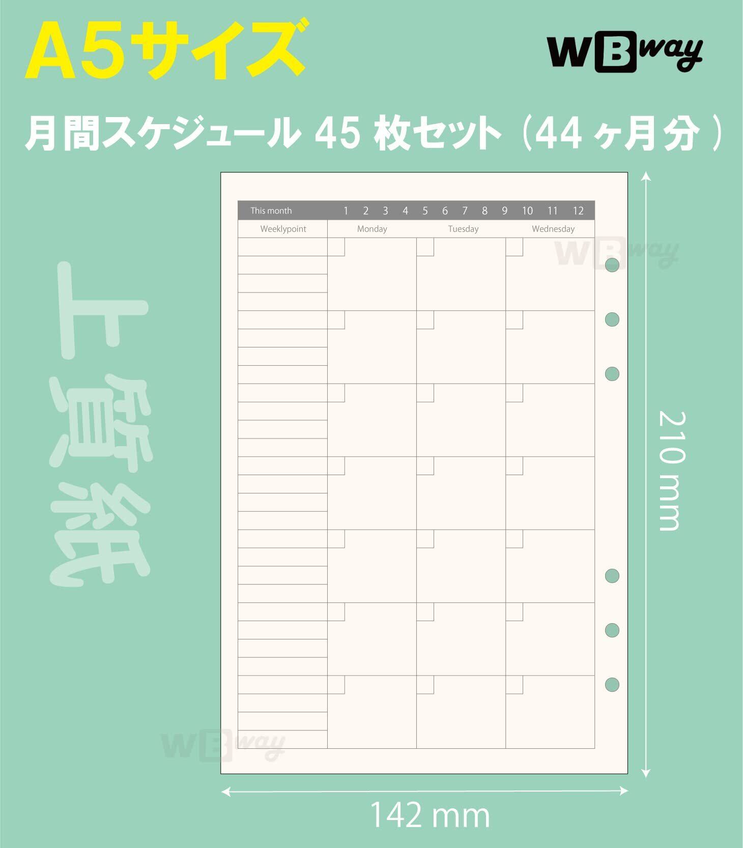 WBway 手帳リフィル A5サイズ 月間 マンスリー スケジュール 6穴 「今すぐ始められる」 日付なしタイプ 月曜始まり システム手帳 リフィル 大容量44ヶ月分 2025 2026 A5 | BASE SHOP